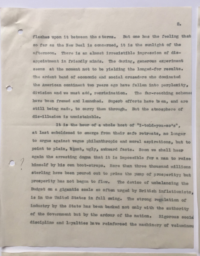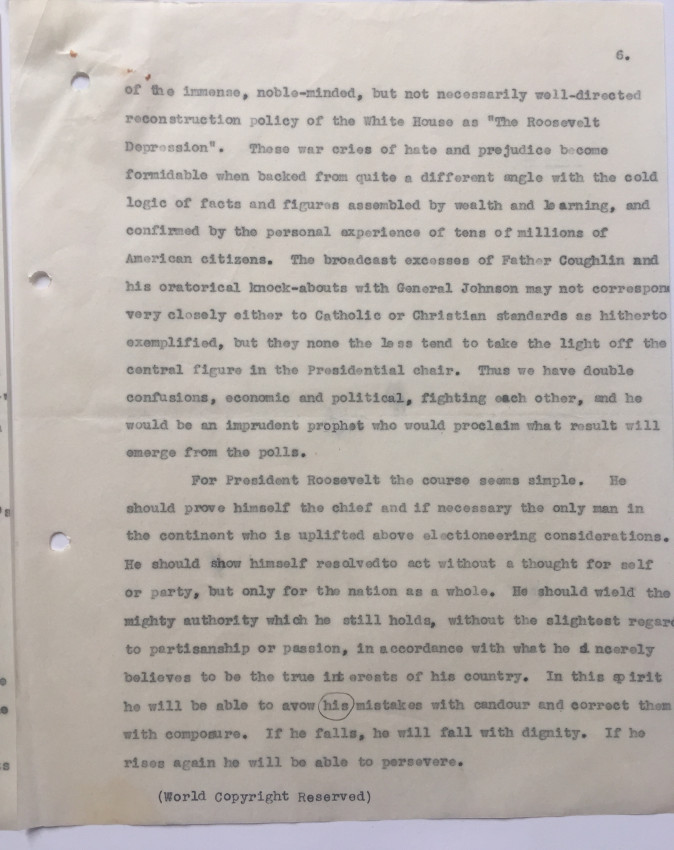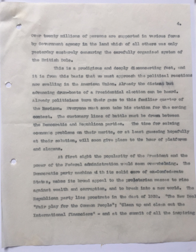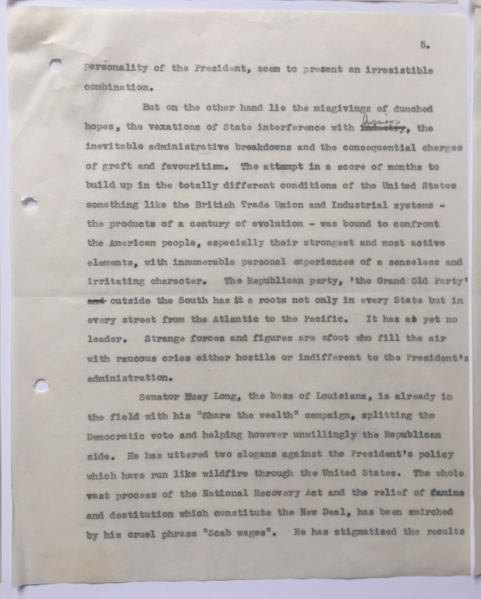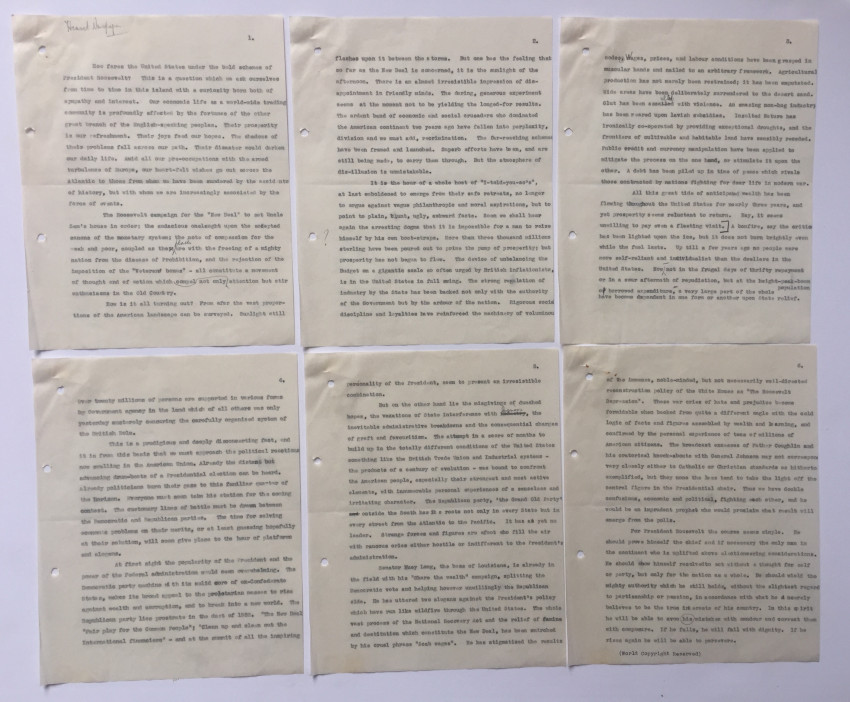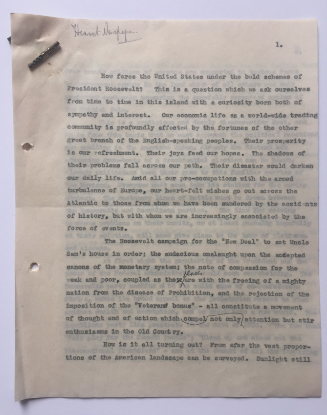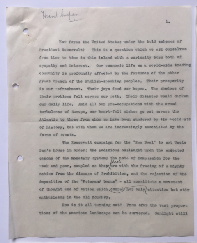 Original carbon copy article, starting “How fares the United States under the bold schemes of President Roosevelt? This is a question which we ask ourselves from time to time in this island with a curiosity born both of sympathy and interest. Our economic life as a world-wide trading community is profoundly affected by the fortunes of the other great branch of the English-speaking peoples. Their prosperity is our refreshment. Their joys feed our hopes.” [No place: undated but April 22, 1935, see lot #7]. 6pp. article with manuscript corrections.