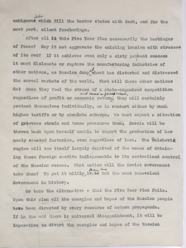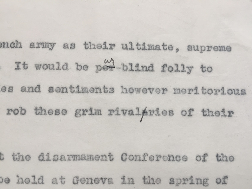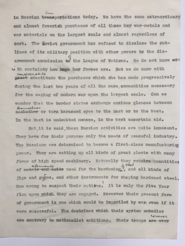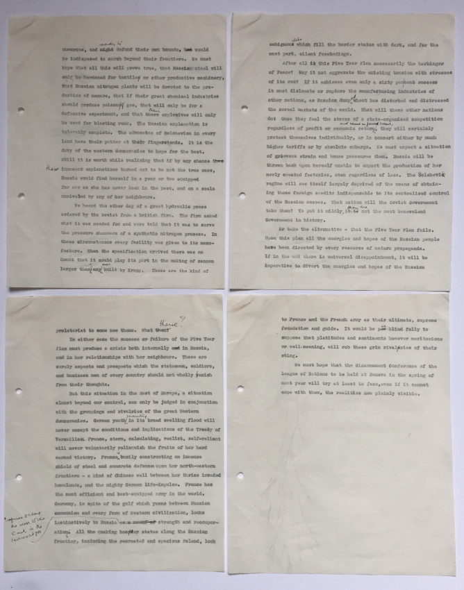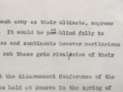 A typescript newspaper article, first line "Is a European war becoming more probable? " with comments on the "United States of Europe", with original hand-written corrections. [Avignon, France: sent 10th August 1931]. 8pp. typescript, the first page of the article is a first-generation typed copy, the others carbon copies with manuscript corrections.