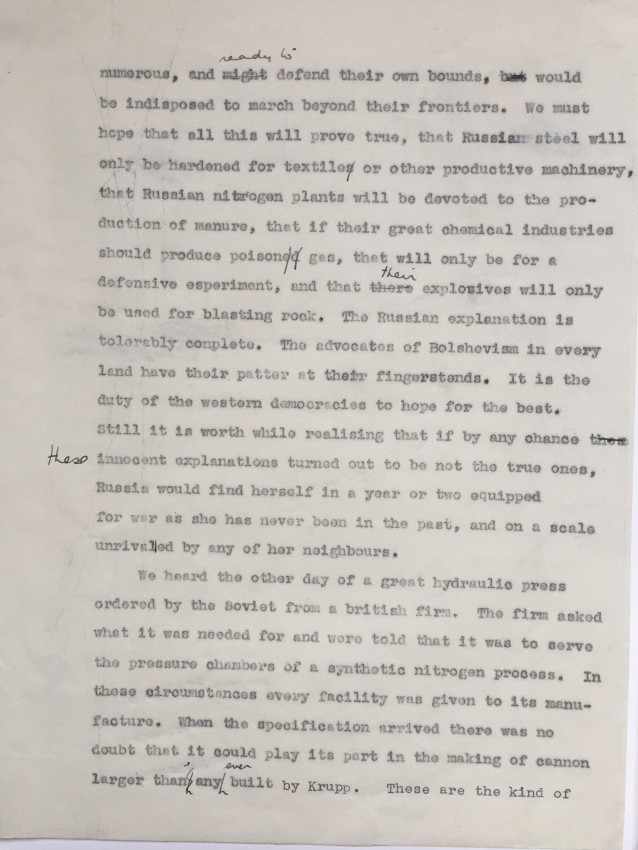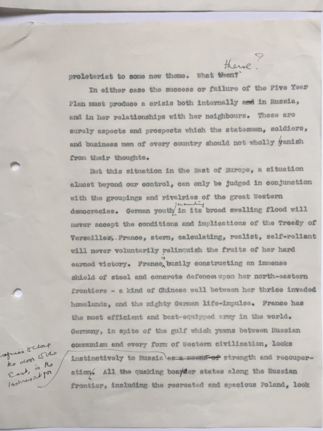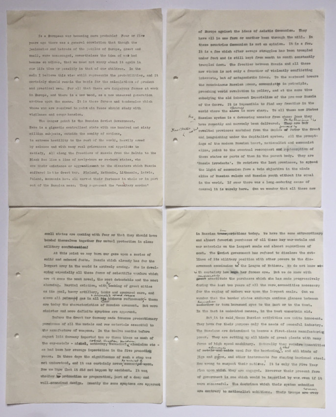 "Is a European war becoming more probable? Four or fives years ago there was a general conviction that though the jealousies and hatreds of the peoples of Europe, great and small, were unassuaged, nevertheless the idea of war had become so odious, ........... The danger point is the Russian Soviet Government. Here is a gigantic centralized state with one hundred and sixty million subjects, outside the comity of nations, in extreme hostility to the rest of the world, heavily armed by science and with many real grievances and appetites to satisfy, all along the frontiers of Russia from the Baltic to the Black Sea lies a line of newly-born or re-born states, who owe their existence or aggrandizement to the disasters which Russia suffered in the Great War. Finland, Esthonia, Lithuania, Latvia, Poland, Roumania have all carved their fortunes in whole or in part out of the Russian mass."