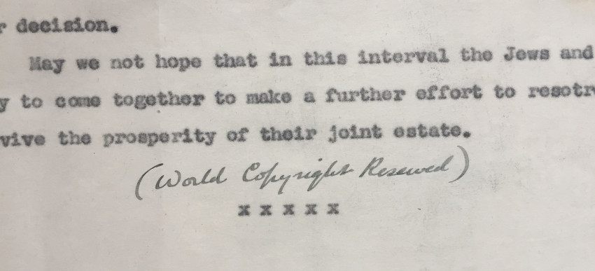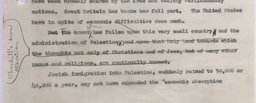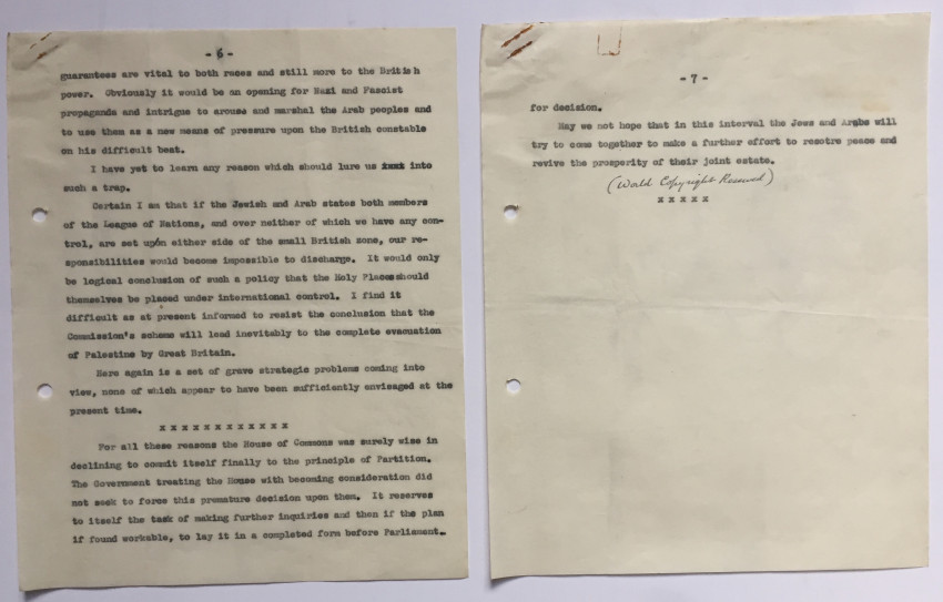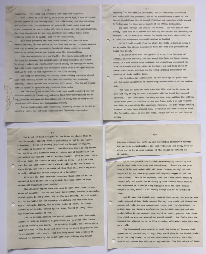 Original carbon copy article, titled "Can partition bring peace to Palestine? by The Right Hon. Winston Churchill P.C. M.P. ", with manuscript corrections. [No place: undated but 1937]. 7pp. article with ms. corrections. "When a royal commission of very able, experienced men, with no Party bias, and no axes to grind, takes more than a year to study a problem with every advantage of information, it would be at once foolish and childish not to treat the recommendations with respect. The Government, which has appointed the Commission, is under a special obligation to pay the greatest attention to all they say. Nevertheless, with the beat will in the world, no one can disguise from himself that the plan of cutting Palestine into three parts is a counsel of despair. It is the expression of a feeling of weariness, and of a desire to lay down responsibility too baffling to be further endured. One wonders whether in reality, the difficulties of carrying out the Zionist scheme are so great as they are portrayed, and whether in fact there not been a very considerable measure of success. In the sixteen years that have passed since the mandate, many troubles have been overcome, and great developments have taken place in Palestine...“