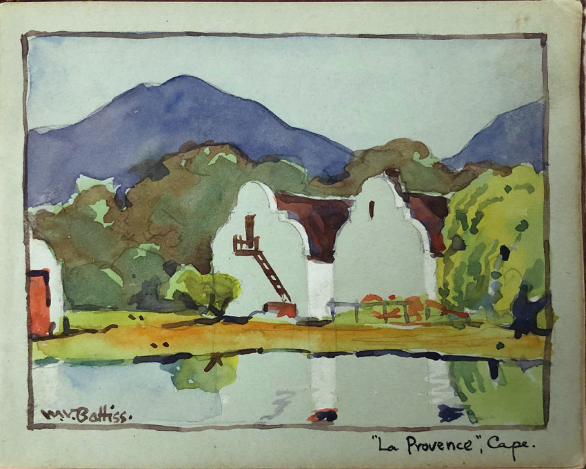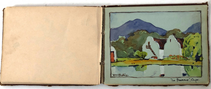 This is a schoolboy's small autograph album measuring 13x10.5cms. The owner of the album was a boy from the Pretoria Boy's High School and it is dated 1936 on the centre page which contains signatures of the owner's friends from "School House". Of note is a charming full page watercolour titled "Le Provence, Cape" and signed by Battiss, who had been seconded to teach at the Pretoria Boy's High School that year. The quality of this small original painting is fine and could readily be framed if so desired. The remaining pages of the album are only partly completed with the usual friend signatures and drawings of little consequence. However this early original Battiss work is significant and unusual.