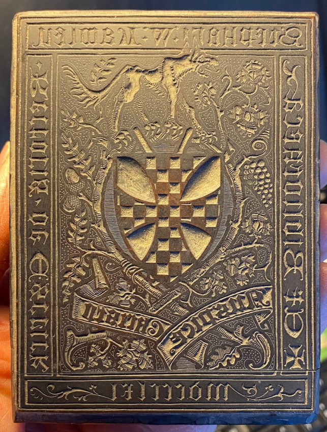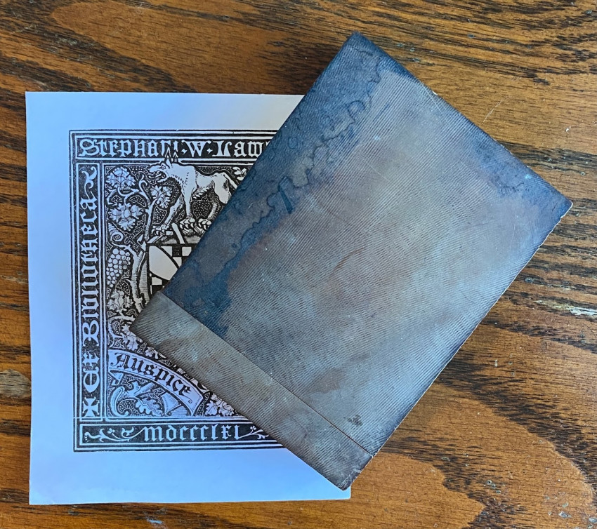 Original woodblock for the Rev. the Hon. Stephen Willoughby Lawley's bookplate, dated 1861. [United Kingdom]: 1861 [or earlier]. Woodblock, in two parts held together with screws (overall 4 3/8 x 3 1/4 x 7/8in; 110 x 83 x 23mm). Condition: excellent.