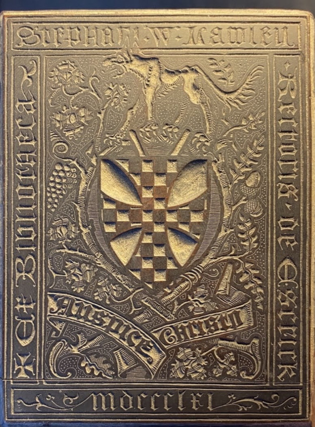 An attractive neo-Gothic armorial bookplate: the Rev. Lawley was quite a distinguished antiquarian (see below), a member of the Arundel Society, and a correspondant with other distinguished bibliophiles. The way the lower section (containing the date) is secured to the main block by screws may indicate that this block created earlier, perhaps with an earlier date (Lawley was rector from 1848 onwards) and then 'updated' in 1862?