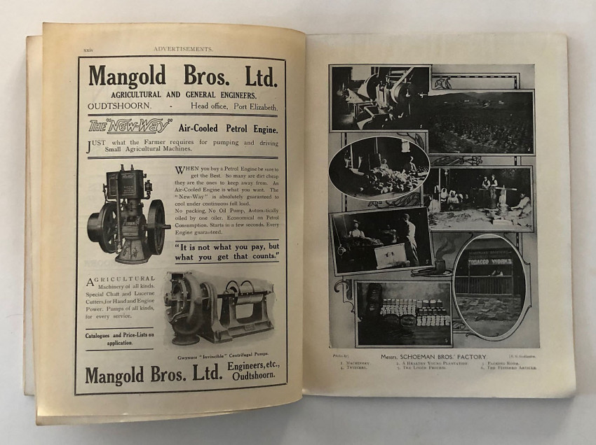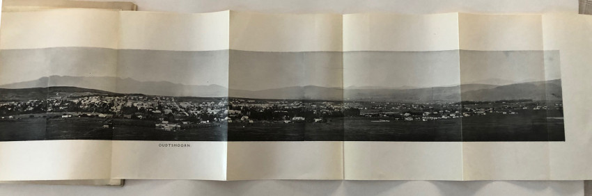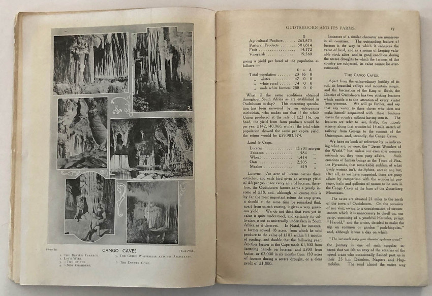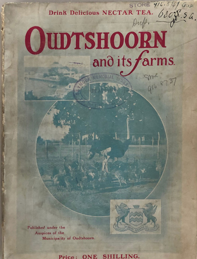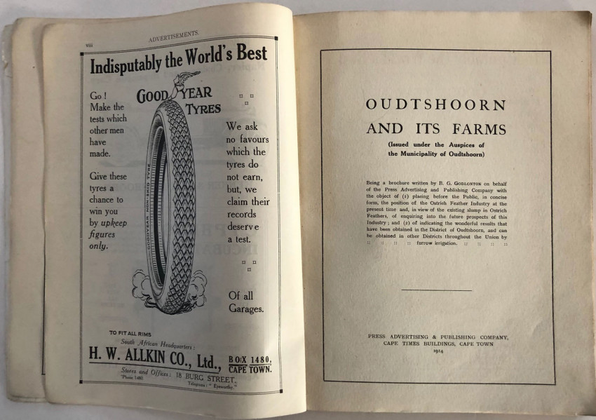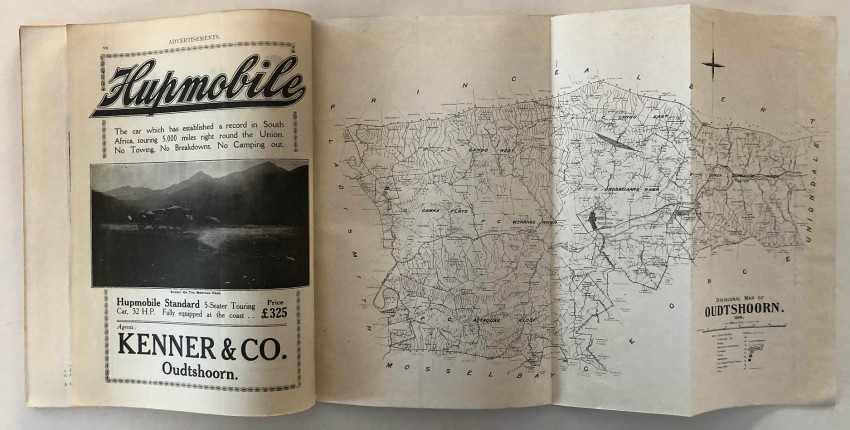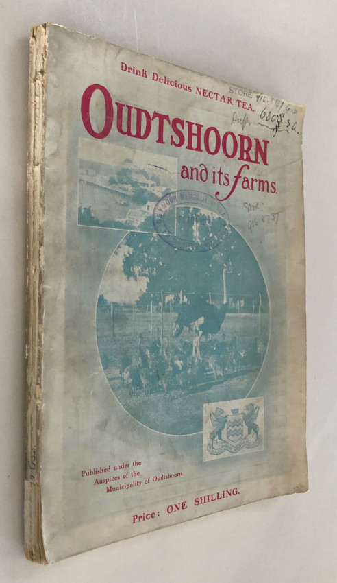 The first edition of this very scarce early twentieth century paperback booklet on Oudtshoorn and its surrounds. 46 pages of text, numerous full page photographic plates (unpaginated) and 40 (xl) pages of vintage advertisements at the front, rear and throughout the volume. The plates include a large folding panorama of Oudtshoorn and also a folding map of the town. In the original fragile illustrated wraps. SABIB Vol. 2, Page 362, where only six copies are recorded.