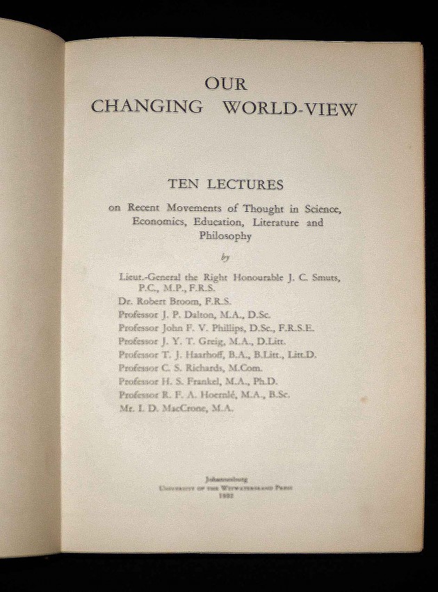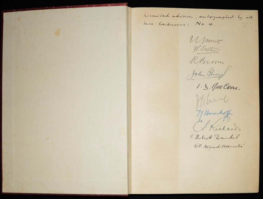 This is a printed version of a Programme of Lectures delivered under the auspices of the University of the Witwatersrand Philosophical Society during the winter of 1932, in aid of the University Library Appeal Fund. The rear flap of the dustwrapper states: A strictly limited edition of this Volume with the autograph signatures of all ten Lecturers is also available from the Librarian of the University only, at 21s. per copy. Each of these copies is numbered. The copy on offer is Number 4.