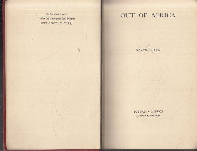 The first English edition of Karen Blixen's (pen name Isak Dinesen) famous memoir of life in Kenya. The book is a lyrical meditation on Blixen’s life on her coffee plantation, as well as a tribute to some of the people who touched her life there. It provides a vivid snapshot of African colonial life in the last decades of the British Empire. Blixen wrote the book in English and then rewrote it in Danish.