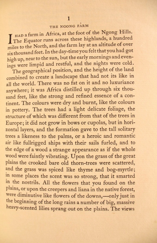 "I had a farm in Africa," the book famously opens, "at the foot of the Ngong Hills. The Equator runs across these highlands, a hundred miles to the North, and the farm lay at an altitude of over six thousand feet. In the day-time you felt that you had got high up, near the sun, but the early mornings and evenings were limpid and restful, and the nights were cold."
