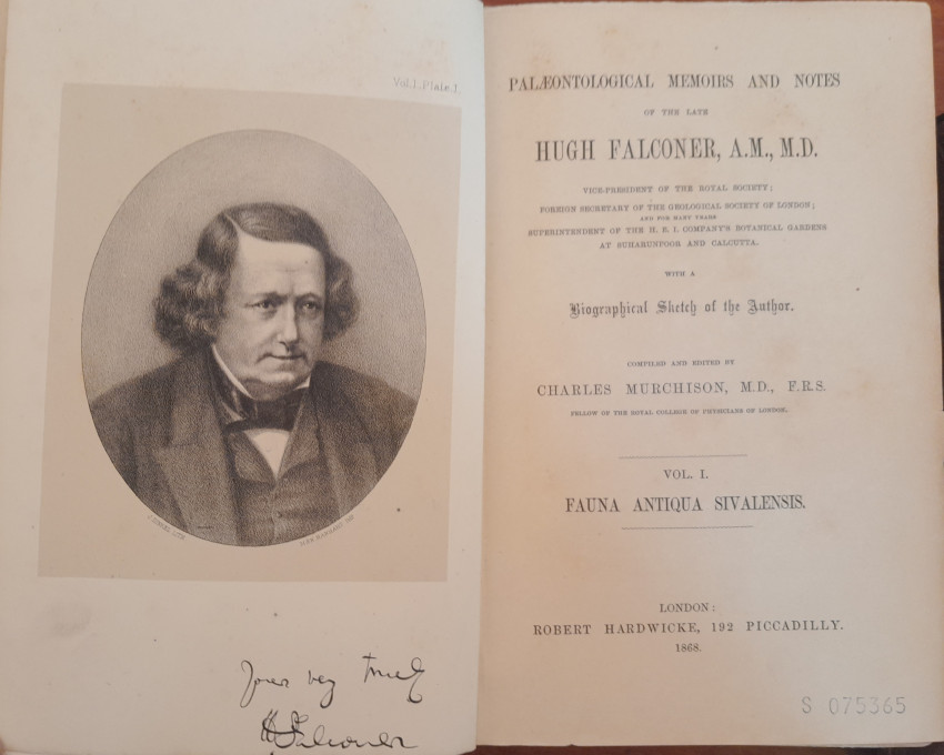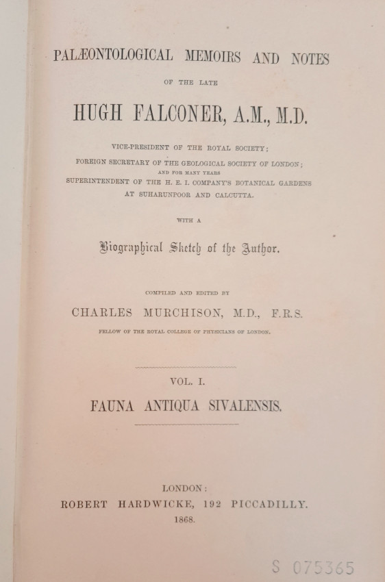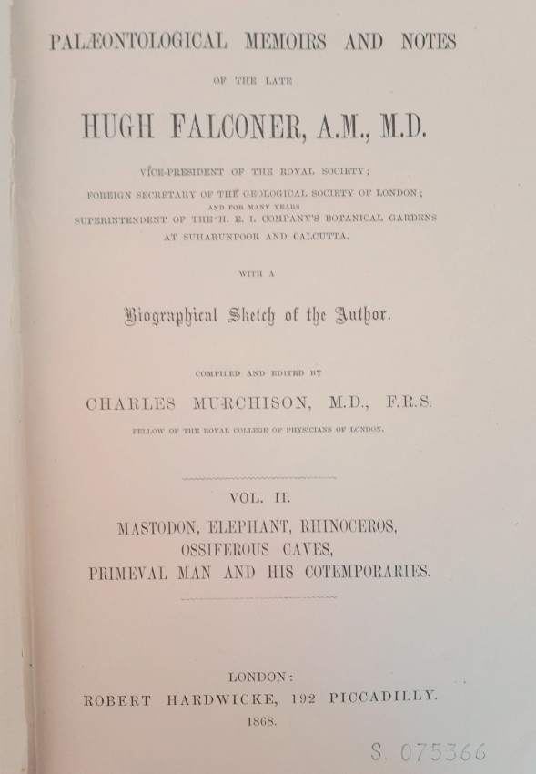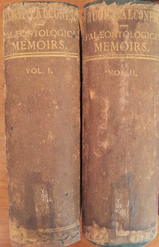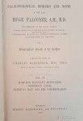 Palaeontological Memoirs and Notes of the late Hugh Falconer, A.M., M.D. Compiled and edited by Charles Murchison. 2 vols. Vol. I: lvi, 590pp. 34 plates, text illustrations, frontis of Falconer. Vol. II: xiii, (77), 675pp. 38 plates, text illustrations.