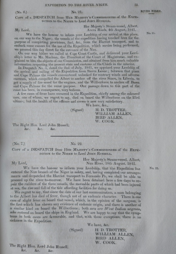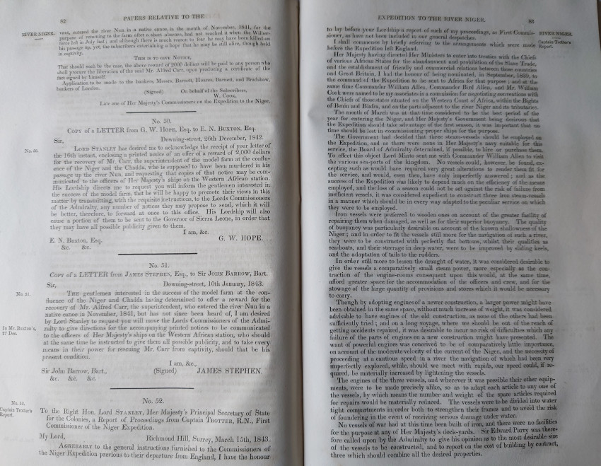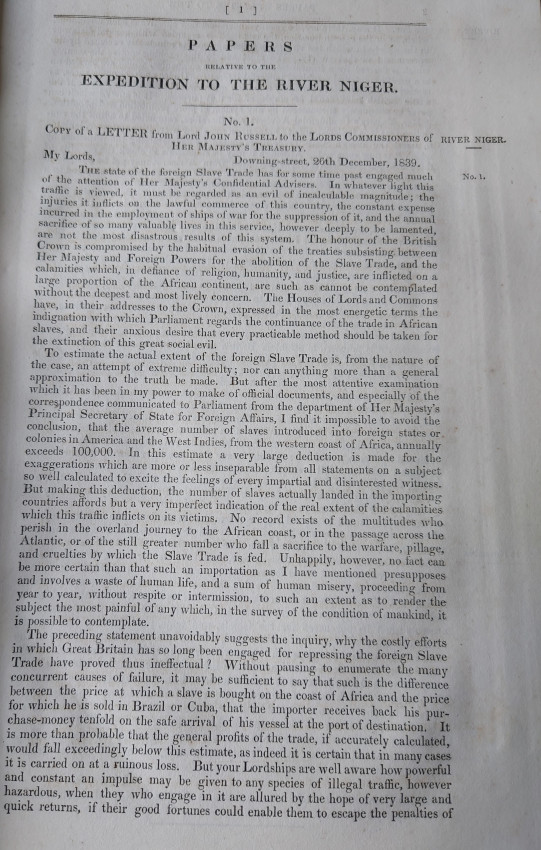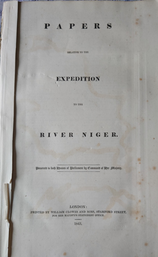 An important Parliamentary Paper detailing the expedition down the River Niger. Undertaking great expense and some danger, the purpose of the expedition was to hamper the International Slave Trade by contacting tribal chiefs along the Niger River and its tributaries. Through establishing commercial relationships with these chiefs, the Expedition hoped to prevent the trade of slaves from Africa to Brazil, Cuba, and the United States colonies.