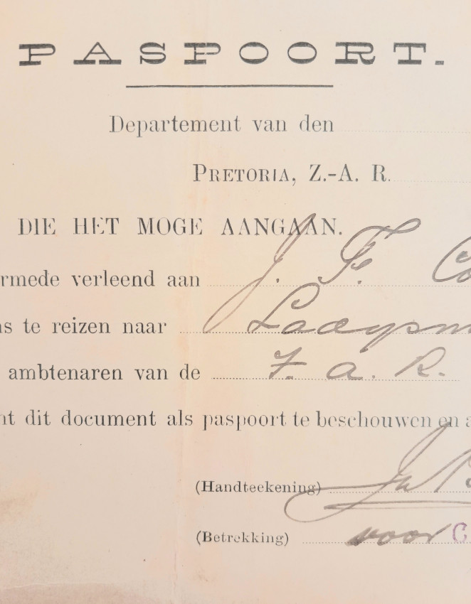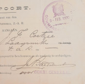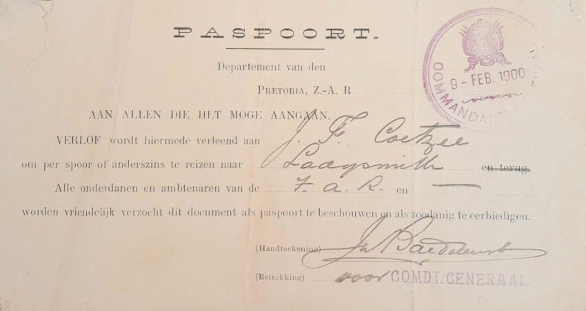 Paspoort (passport) issued on 9 February, 1900 by ZAR to JF Coetzee.