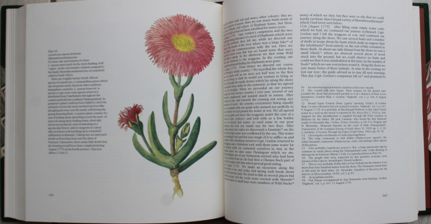 William Paterson (1755—1810) was commissioned in 1777 by the Countess of Strathmore to collect plants at the Cape. A variety of new species was discovered on the young Scot’s four journeys which covered 9000 km, embracing a grand sweep from the mouth of the Orange River in the west to the banks of the Keiskamma River in the east. Paterson’s original manuscript journal is here fully annotated, and illustrated with plants, people, scenery and animals – all published for the first time. The journal is the first full-length account in English of extensive travel in the interior of Africa. -The Brenthurst Press.
