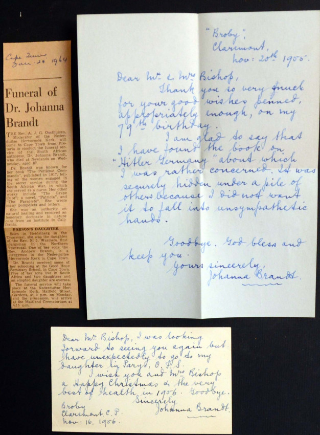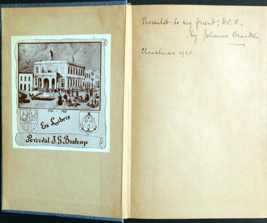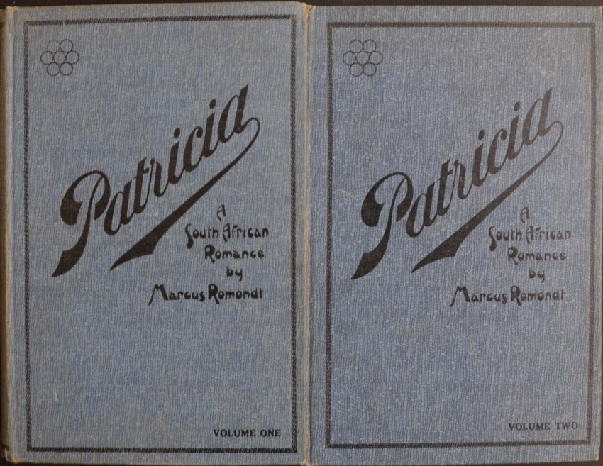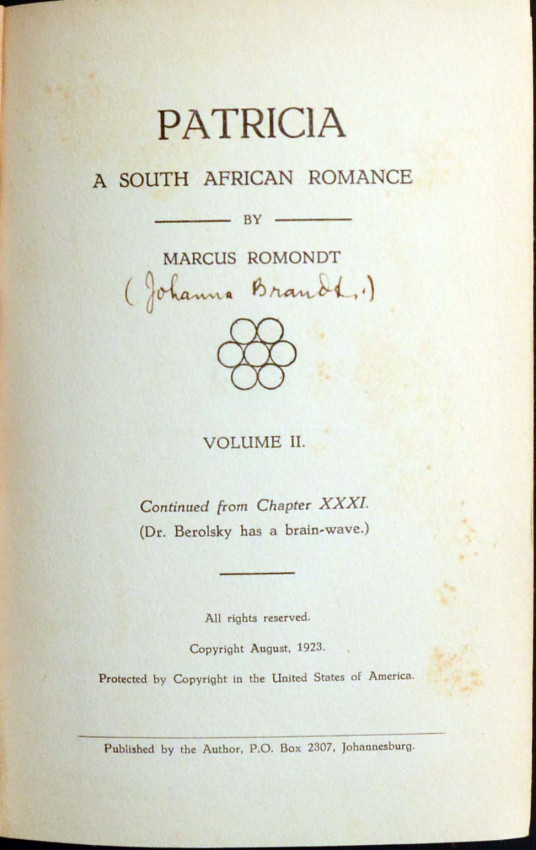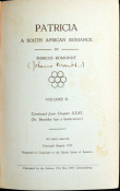 Exceedingly scarce 2 Vol. novel by Johanna Brandt (of Petticoat Commando fame) written under the pseudonym of Marcus Romondt. From the library of Percival Bishop (bibliophile and author of the important book on South African Bookplates) with his bookplate on the pastedown of each volume and inscribed by Brandt on the ffep. of Vol.2 "to my friend D.C.B". She has also appended her name under that of Romondt on the title page of Vol.2. An amazingly fresh - near fine set of this almost 100 year old work in the original blue cloth. Laid in to Vol. 1 are i) an autograph postcard and ii) an autograph letter, both from Johanna Brandt to Percival Bishop. There is also laid in a small browned newspaper clipping from the Cape Times of Jan.24th. 1964 regarding the funeral of Dr. Johanna Brandt. This clipping refers to her writings and mentions Patricia amongst them.