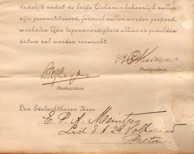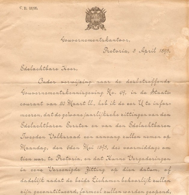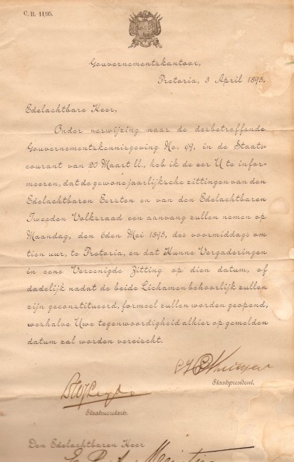 Original letter issued by the Gouvernmentskantoor (Zuid-Afrikaansche Republiek Parliament), Pretoria, 3 April, 1895. Signed by ZAR President Paul Kruger and the State Secretary Leyds. The letter is addressed to E Meintjies, Member of the 2nd Volksraad, informing him of the annual general meeting of the First and Second Volksraad on 6 May 1895. Some stains on the right hand side of the page, otherwise good.