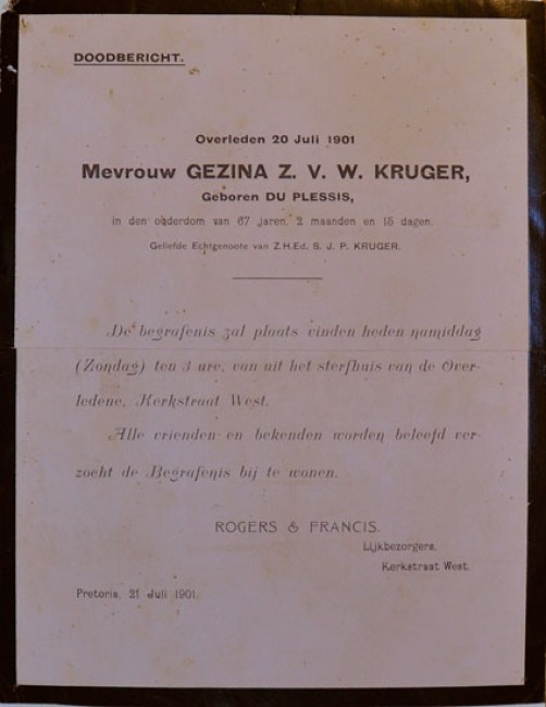 Single 4to. sized leaf announcing the death of "Mevrouw GEZINA Z.V.W. KRUGER, wife of President S.J.P. (Paul) Kruger, on 20th. July 2001, and announcing her funeral on the coming Sunday. An unusual and scarce piece of Africana ephemera in good condition.