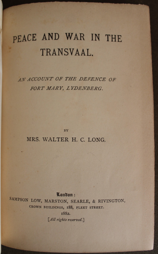 The first edition of this very scarce title recounting the unsuccessful defence of Lydenburg during Siege of Lydenburg in 1881, resulting in the onset of the First Anglo Boer War. This account was written by Mrs. Walter Long, wife of the British Commander of this operation, Second Lieutenant Walter Long. The author was also present in Lydenburg during the siege so this is a first hand report. 128pp. Small 8vo. In the original green gilt embossed cloth. SABIB Vol. 3. Page 158.