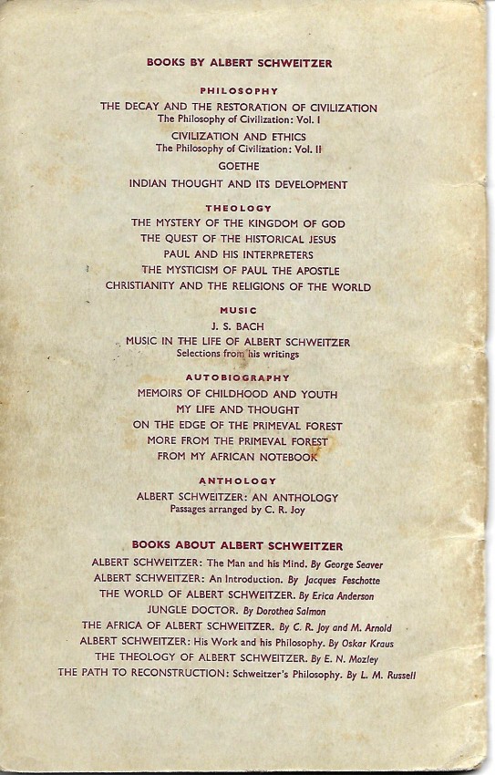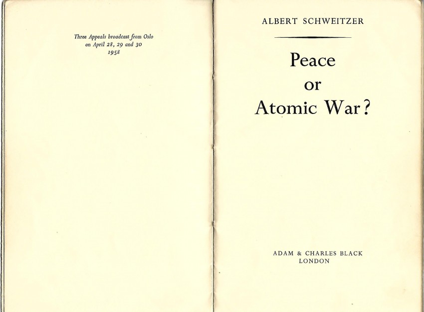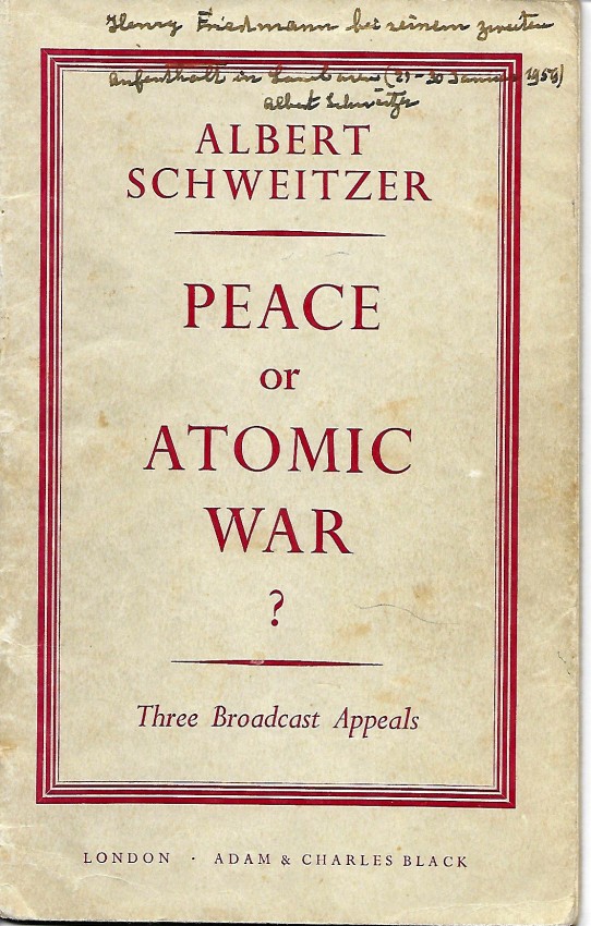 28pp. pamphlet in the original sewn grey wraps with red lettering. Comprises the three Appeals broadcast from Oslo on April 28, 29 and 30, 1958. This copy bears a signed inscription (in German) from Schweitzer to one Henry Friedmann, believed to be a relative of Sarah Gertrude Millin as it originated from her library and her mother's maiden name was Friedmann.
