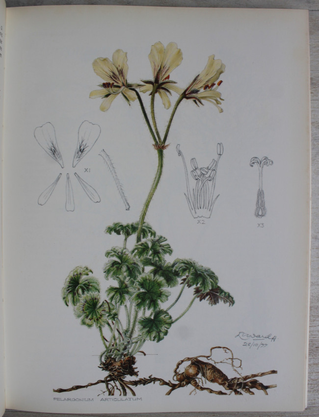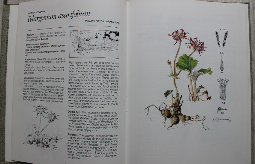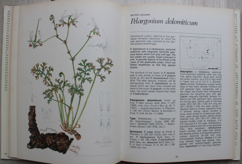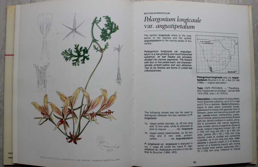 In all, 150 species are described and illustrated. "The nomenclatural exposition of each species is followed by a formal diagnostic description of the plant. These descriptions are detailed and straightforward, with limited use of technical terms. Areas of distribution are discussed, together with notes on historical backgrounds and cultivation. Growth requirements have been personally studied by the authors and in most cases the plants have been grown and observed in the Botanic Garden at the University of Stellenbosch. Each species is accompanied by a magnificent watercolour painting by Ellaphie Ward-Hilhorst, who must rank among the top botanical artists in the country. There are also pencil habit sketches drawn superbly well by this renowned artist. In some instances this is the first time that these plants have been reproduced in colour anywhere." - From the foreword to the third volume.