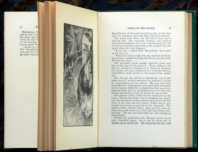 \"The Kalahari Desert, in Souhern Africa, is crossed in the middle by the Tropic of Capricorn. To the west lies the mountainous Namaqua Land, to the East the Transvaal and the land of the Bechuana, while the Orange River shuts out the large division of the Cape Colony on the south. Through this wild region a single horseman was making his way on the afternoon of a flaming summer day a brief while ago. He was in the attire of a hunter, with strong leathern leggins, which covered his knees like calvary boots, a short coat belted at the waist, and the orthodox helmet hat, white in color, and which, while it seems to be warm, has been proven to be the best protection that can be devised against the African Sun. He supported across his saddle a fine double barreled rifle of the breech loading pattern, while an excellent revolver was always at instant call. In truth, the young man could not have been better armed and equiped for the perilous business on which he was engaged. Tim Dougherty was his name, and he was a native of Ireland..not yet eighteen years of age........\"