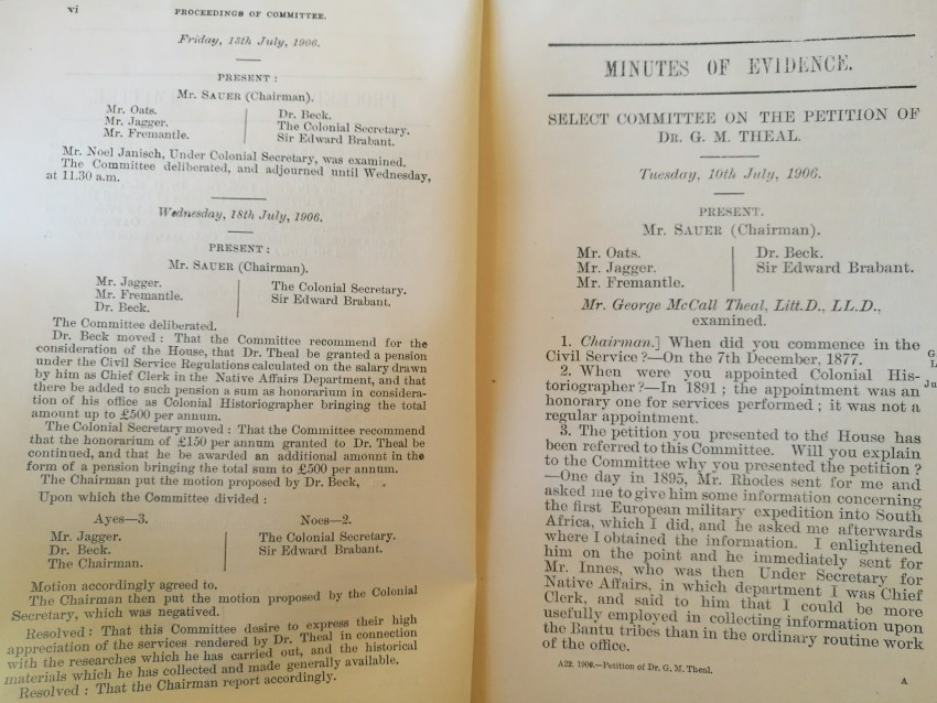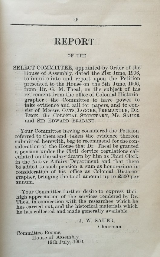 - Your Committee having considered the Petition referred to them and taken the evidence thereon submitted herewith, beg to recommend for the consideratio of the House that Dr Theal be granted a pension under the Civil Service regulations, calculated on the salary drawn by him as Chief Clerk in the Native Affairs Department and that there be added to such pension a sum as honorarium in consideration of his office as Colonial Historiographer, bringing the total amount up to 500 pounds per annum.