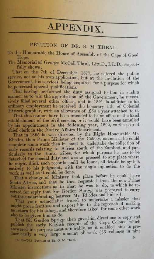 Dr Theal had originally held a senior post in the Department of Native Affairs until he was invited by Prime Minister Cecil Rhodes to be Colonial Historiographer and to study early English records of the Cape. Rhodes's successor, Sir Gordon Sprigg, confirmed the appointment and asked that Portuguese records should be added to Theal's task.