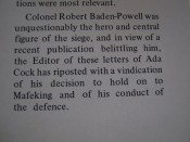 Apart from appendixes, reference and index, much of the rest of the book is devoted to a spirited defence of the commander of the besieged town\'s garrison, Colonel Baden-Powell, whose achievements had been downplayed in Brian Gardner\'s \"Mafeking - A Victorian Legend\", which had been published eight years previously.