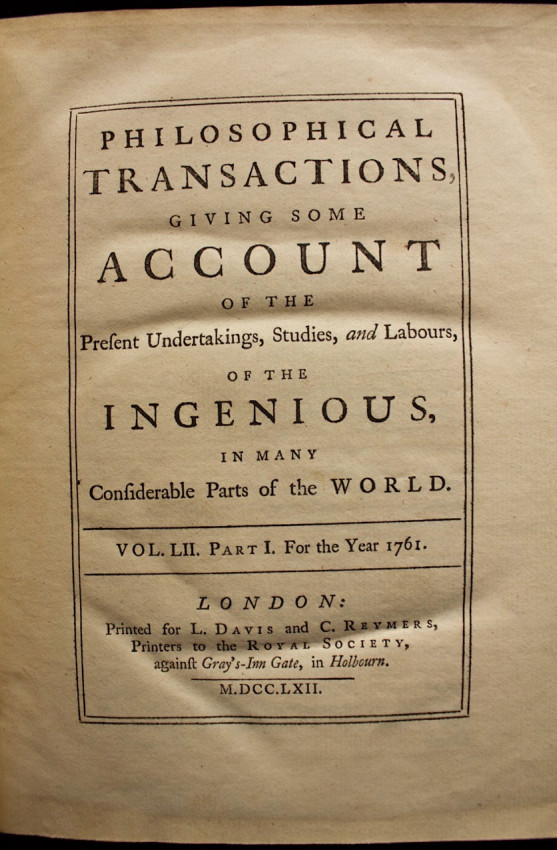 A scientific publication for the Royal Society containing contributions by various authors on natural history, astronomy and science. Some articles on the eruptions of Mount Vesuvius, the transit of Venus etc., but of particular interest as an item of Africana are chapters 60 & 61 (pages 378-395), namely: