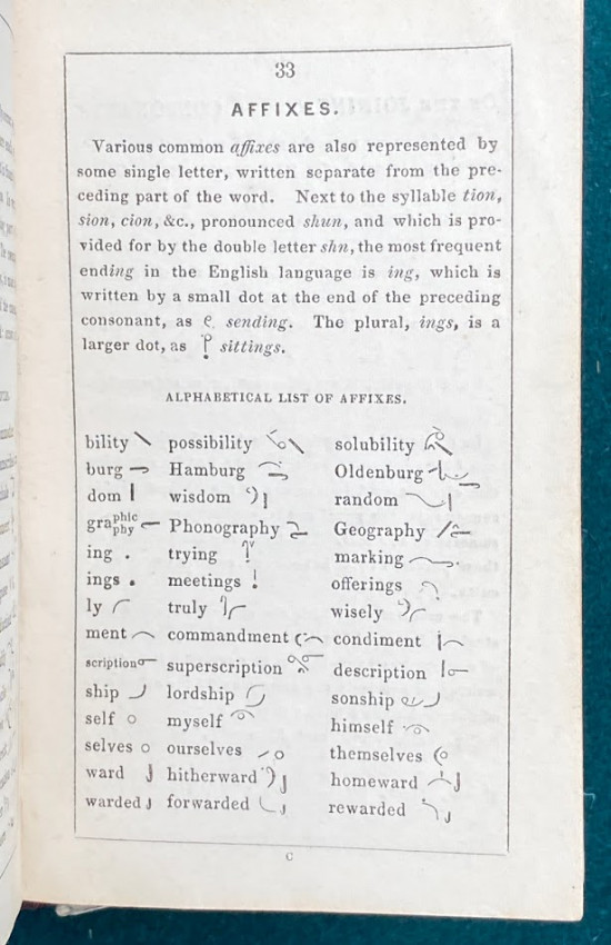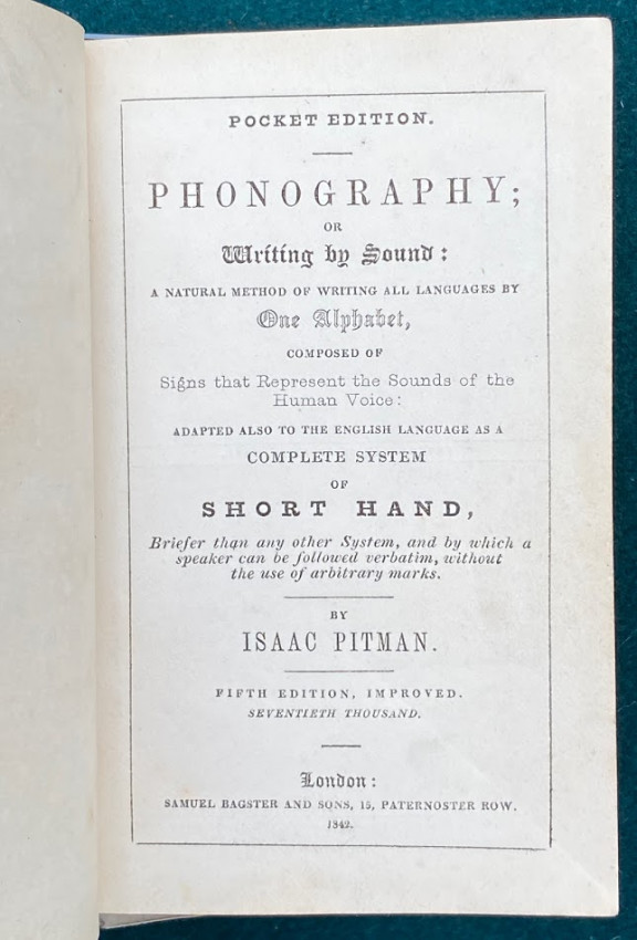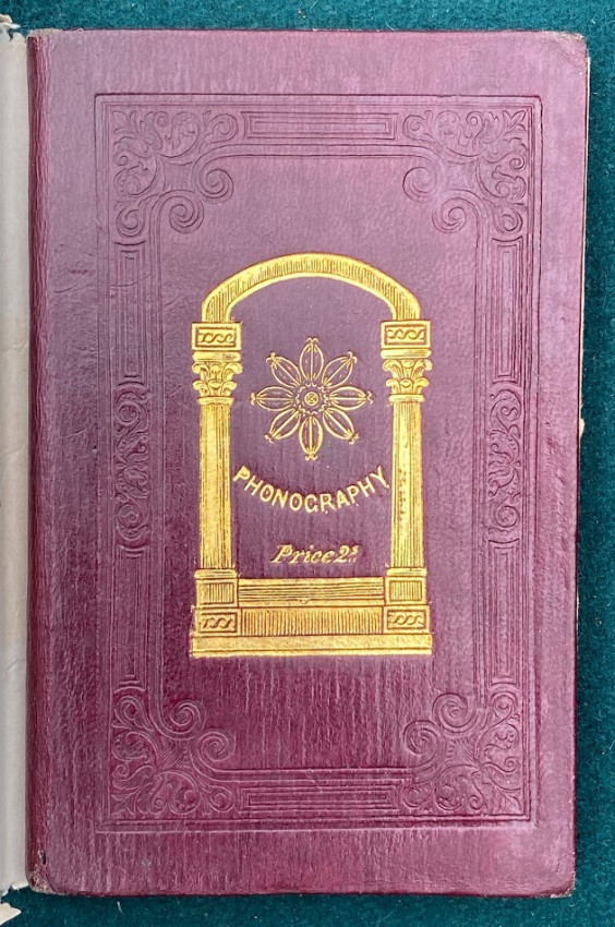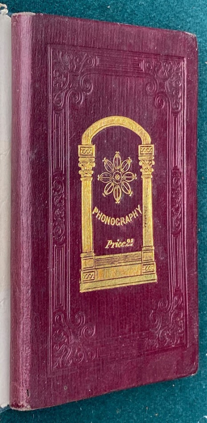 Phonography; or Writing by Sound … adapted also to the English Language as a complete system of Short Hand … Fifth Edition, Improved. Seventieth Thousand. London: Samuel Bagster & Sons, 1842. 16mo (4 ¾ x 3in; 121 x 76mm). Pp. [1-]64. (Short clean tears to outer margins of pp. 35-44.) Original maroon leather by 'W. Taylor, binder, of Bath', covers with an elaborate decorative outer border blocked in blind, the upper cover with decorative central panel in gilt, cream-glazed endpapers. Provenance: C.C. Wharton (inscription dated 1843).