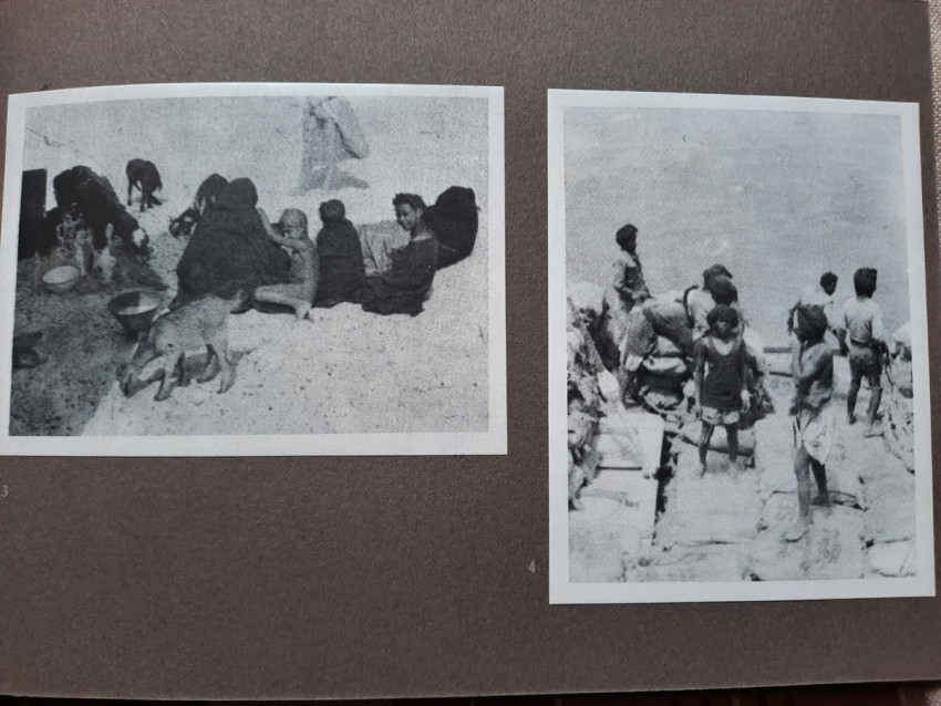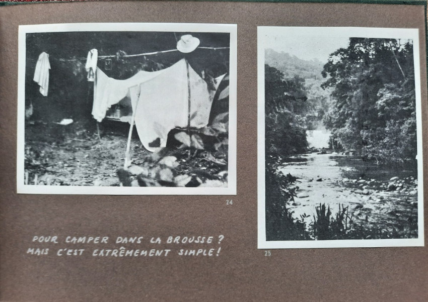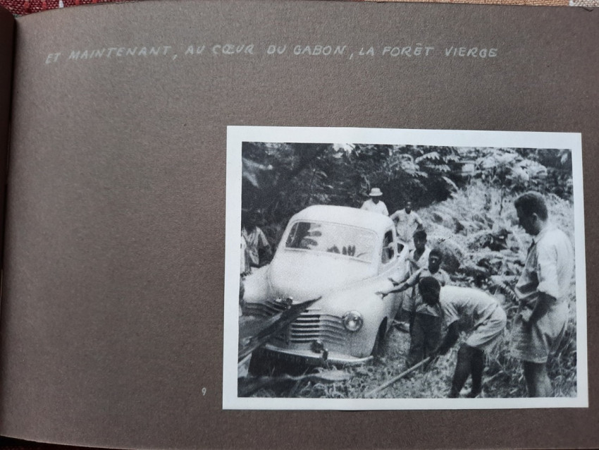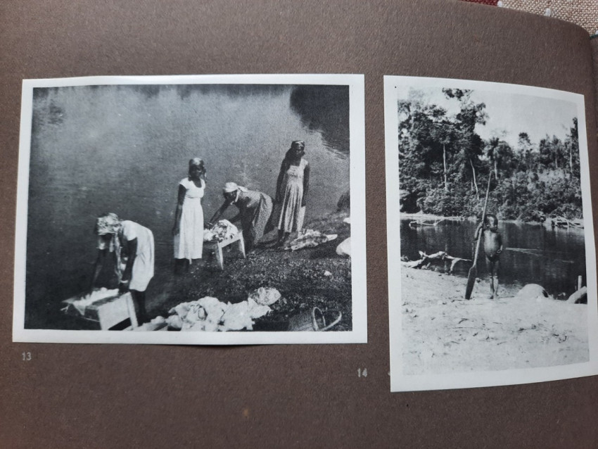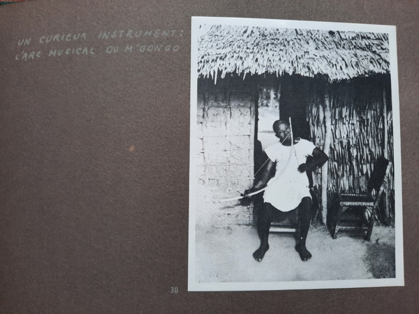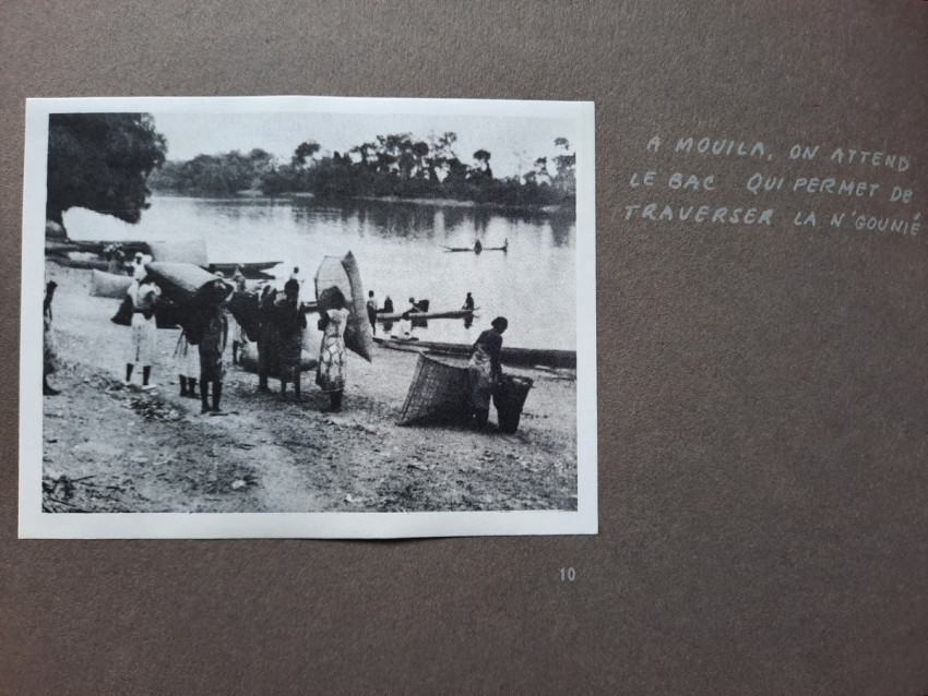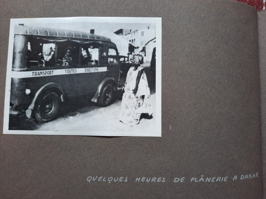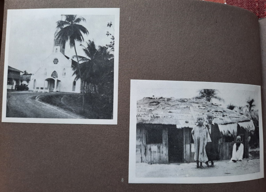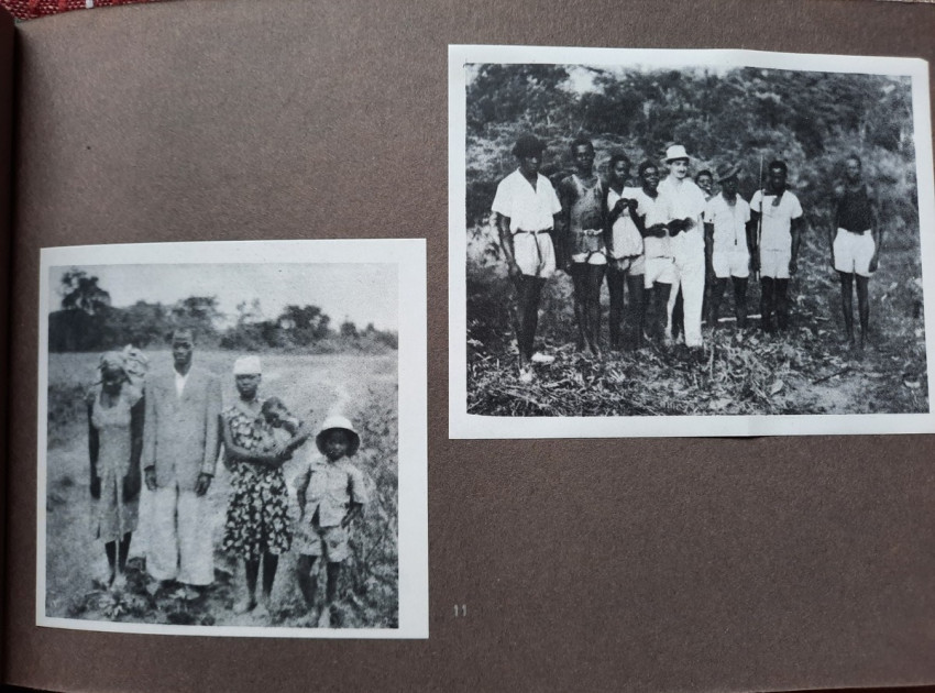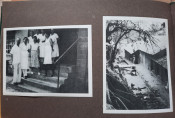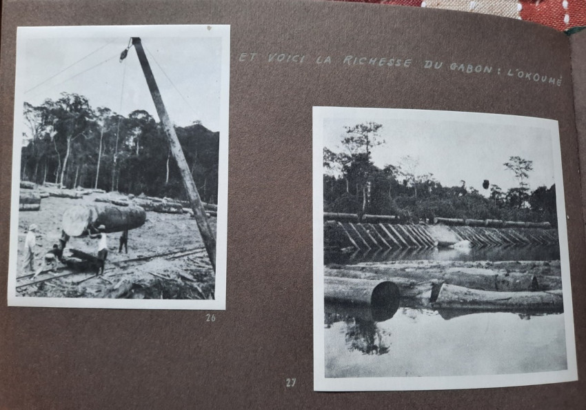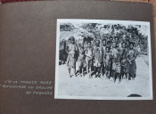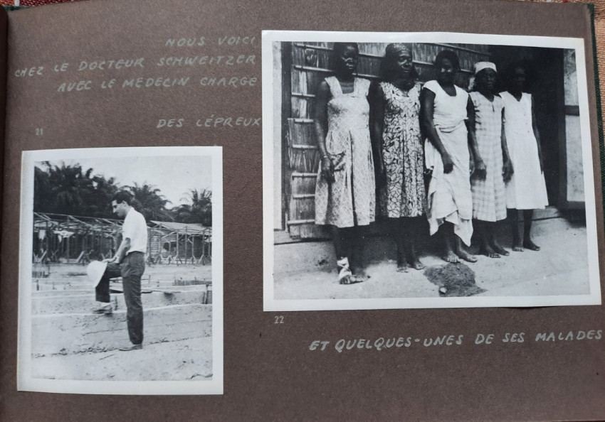Unique album with 16 sheets of strong paper, and 4 sheets of yellow paper with captions for the 32 unique black & white photographs. All pages are pictured. The photographs shows: A Bandj'bis fertility fetish (reproduction on photo paper); The liberty ship "Rochefort"; Native family in Port-Etienne, native workers in Port-Etienne; The Moors who load fish; Native chief with a two of his wives and two of his children; Hairdresser woman in Lemamba (in country Bandj'bi) with the woman she does her hair and two childrens; A group of pygmy peoples; "So, are you taking me to Paris?" - This was the question posed to the photographer by the central character of this shot, which shows the daily drudgery of laundry (four native woman), in N'gounie, in Mouila; Indigenous district of Dakar; The Sainte-Marie Cathedral in Libreville; Children in Moumbaka; An Eschira chief (Bapounou/Eschira is one of the native languages/tribes) with a two of his wives and two of his children; The son of the paddler from N'gounié; A community of Bandj'bis and Pygmies; at hospital of Dr. Schweitzer and his stuff; Dr. Lange who was in charge of lepers and some of his patients (five women on separate photo); three photos with "the wealth of Gabon" (Okouome) showing extracting trees and transmission by river and road, etc.