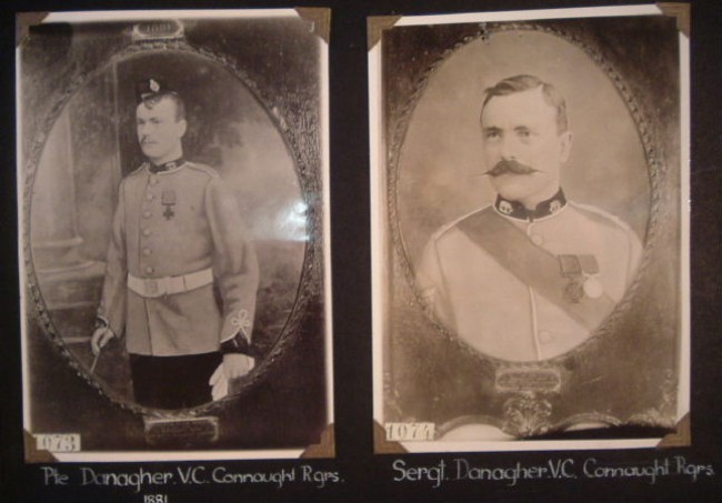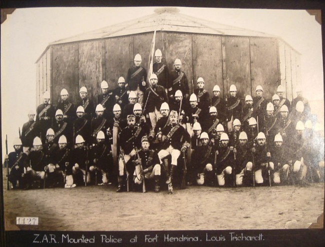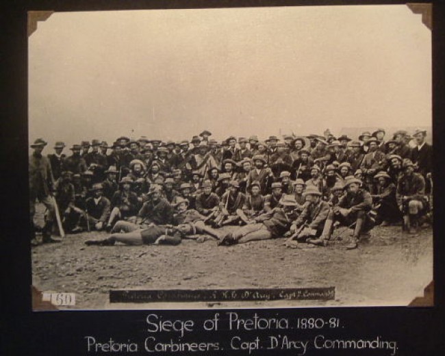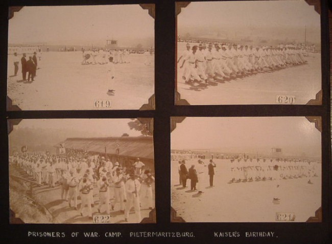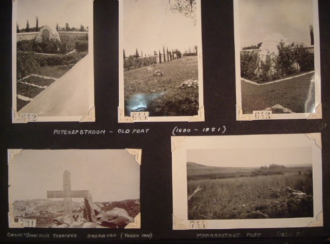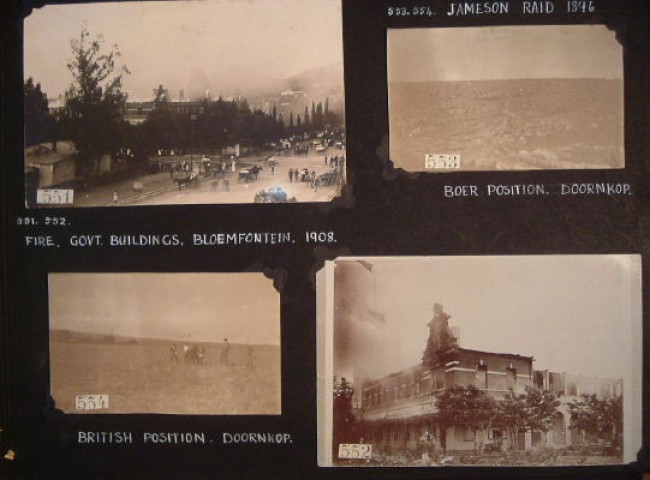 A most interesting album of original and reproduction photographs depicting scenes in South Africa between 1880 and 1914. Scenes include some from the First Anglo-Boer War of 1880-1881, the Jameson Raid of 1896, opening of various railway lines, a few of the Second Anglo-Boer War, burning of government buildings in Bloemfontein in 1908, and photos of various German prisoners-of-war in Pietermaritzburg & Pretoria. There are also a few portraits of military figures and church wardens, etc.. The photos vary in size from 11 x 8 cm to 20 x 15 cm. Altogether there are about 46 leaves, each with between one & five photos. The majority of the photos relate to the First Boer War - perhaps the collector of the album was involved in it. There are two photos of Sgt. Danagher, V.C. of the Connaught Rangers who won the V.V. near Pretoria during the First Boer War. Good condition, although the binding screws are no longer functioning and the pages are loose