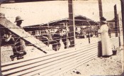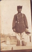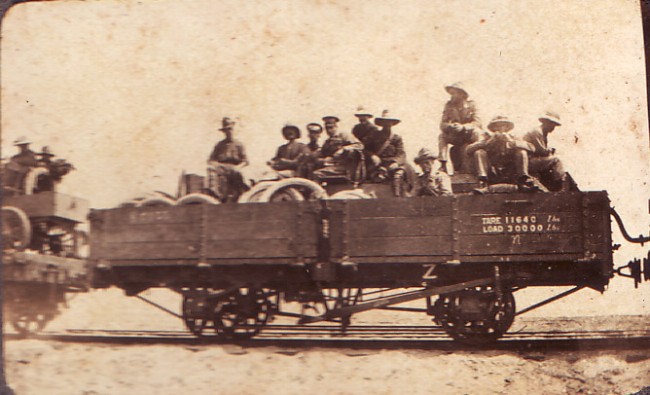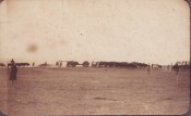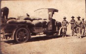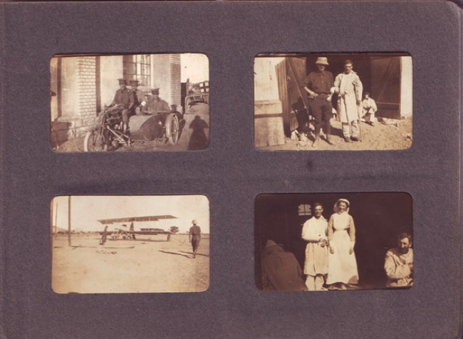 Photo album containing 84 bw photos, dealing mainly with Botha\'s campaign. It commences with (dis?)embarkation, then entrainment, and later progress of a motorised detachment across the desert, as well a some of a despatch-rider on a motorbike, a hospital and an aeroplane. A number of scenes of SWA: harbours, towns, captured troops in a camp etc. The last two leaves are snapshots taken on the voyage and the owner\'s return to the Cape, as well as two odd photos of tribesmen fishing in a river. Photo size 57 x 35 mm