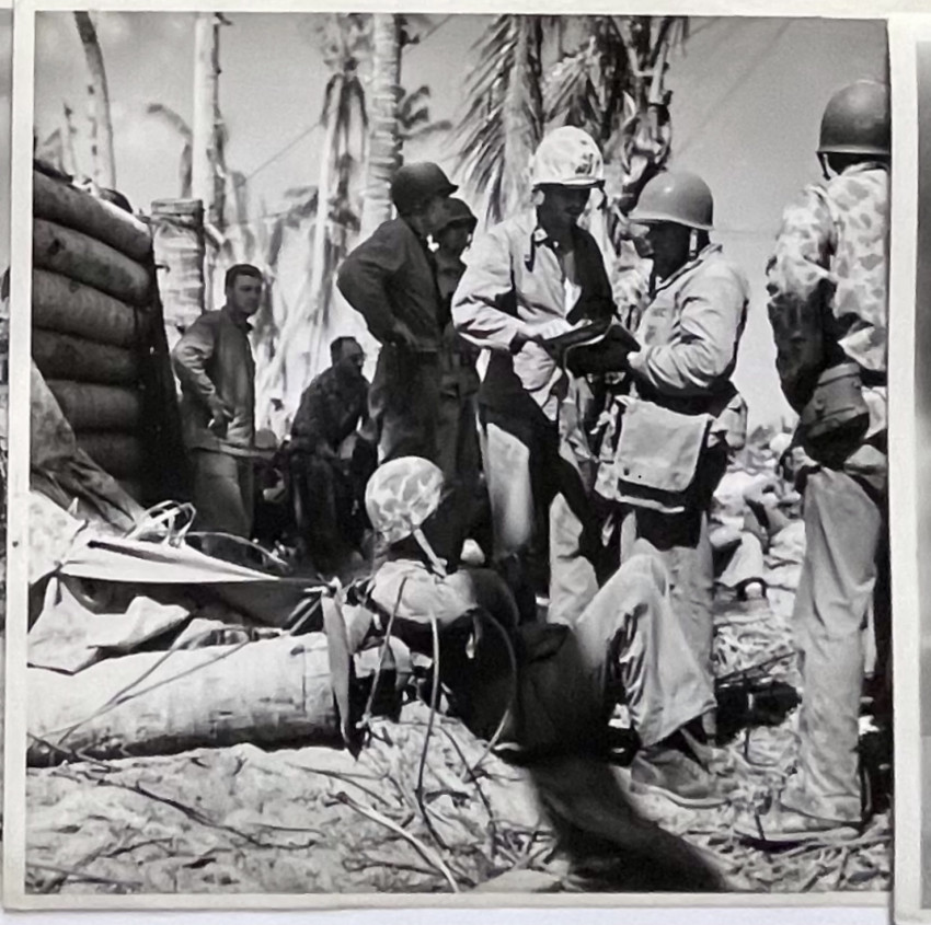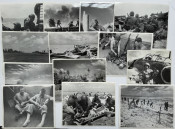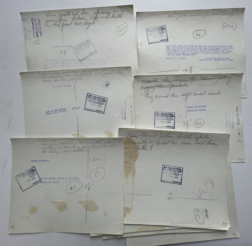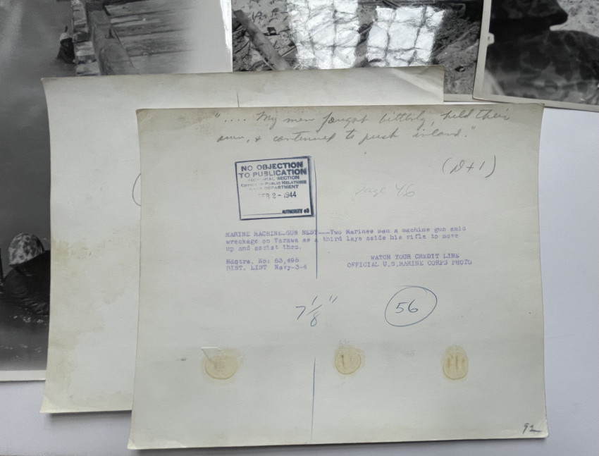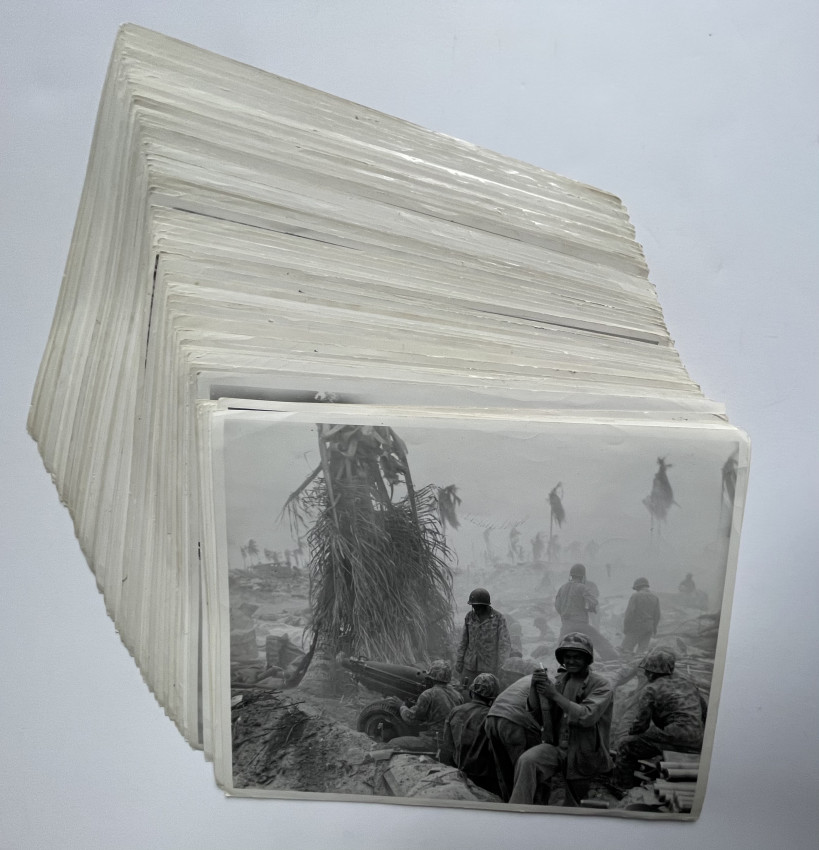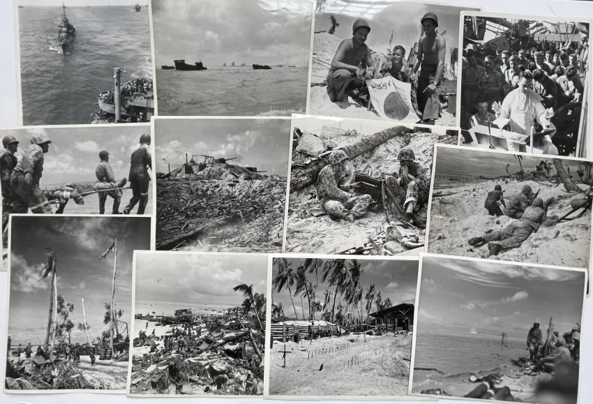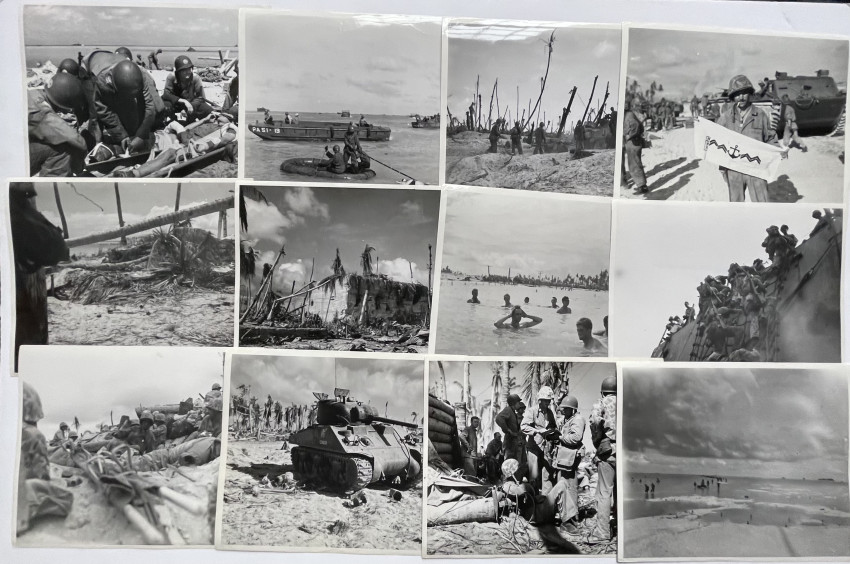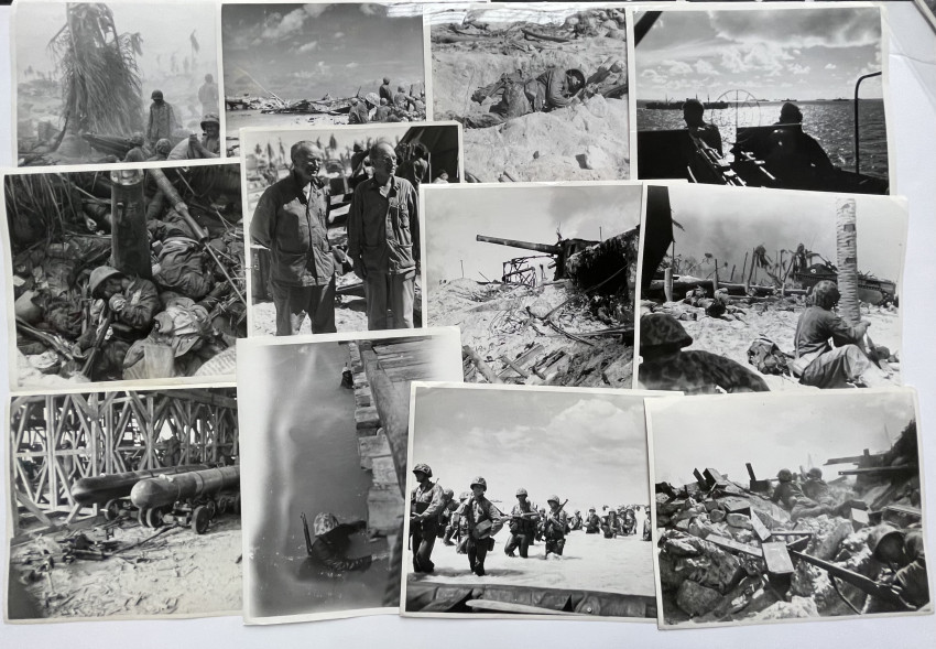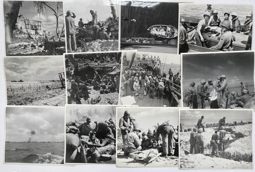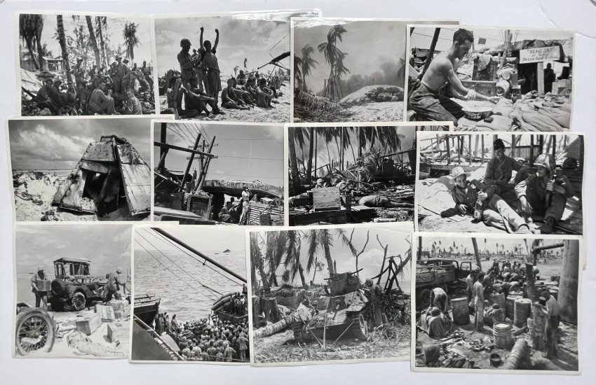 Circa 75 Official US MARINE CORPS photographs documenting the fight for Tarawa, many with captions and stamping, including release date of Feb. 2, 1944. Early Marine Corps photography; handwritten notes on verso.
