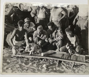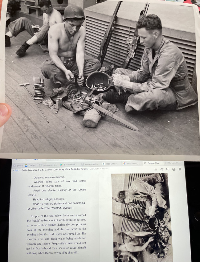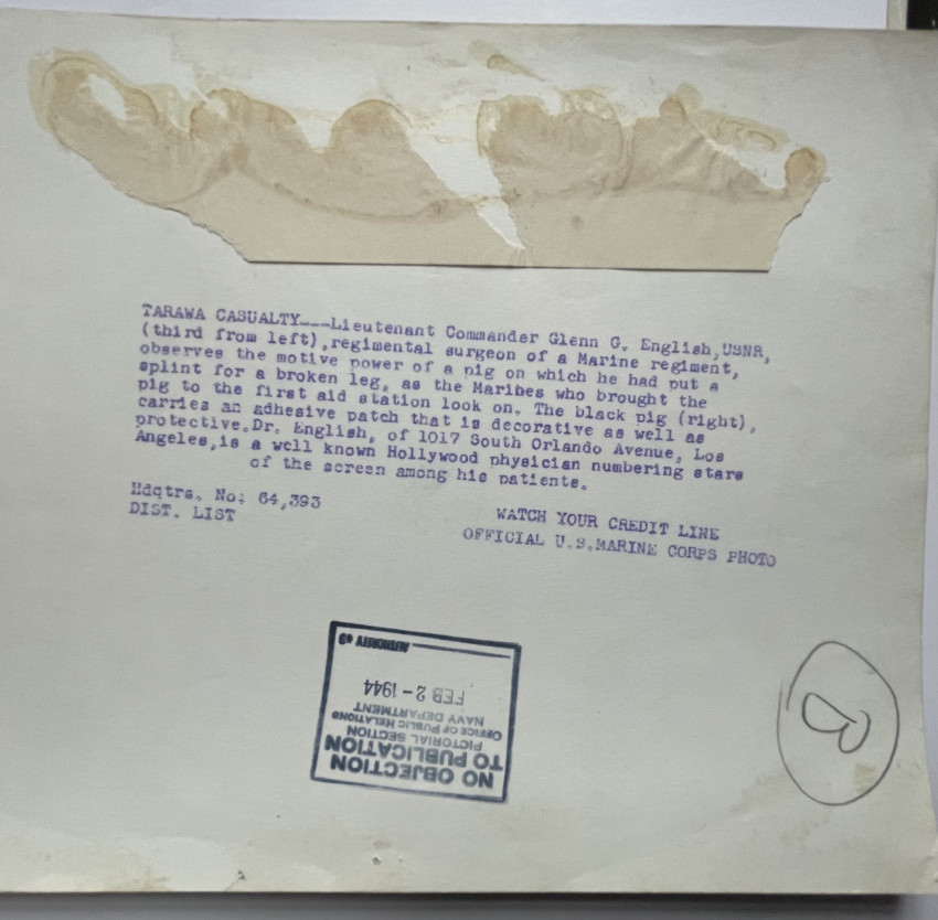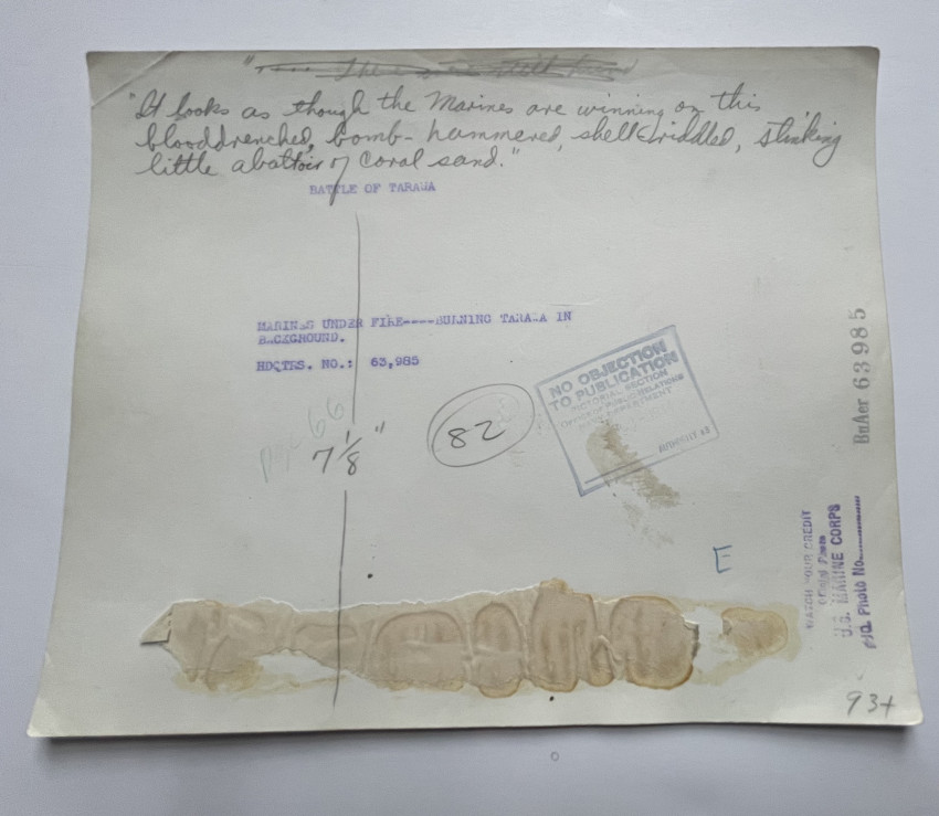 The majority of these original photographs appear to have been used in the selection of images which subsequently appeared in the book "Betio Beachhead, U.S. Marines’ Own Story of the Battle for Tarawa" (Putnams, New York, 1945). The images which were used can be identified as they all have the relevant quotes from the book written in pencil on the versos. A sample caption: “Each is a hero in his own right. I am proud of them...they may not have rank, prestige or background, but they have greater substitutes—” is on the verso of a photograph showing a smiling soldier at rest.
