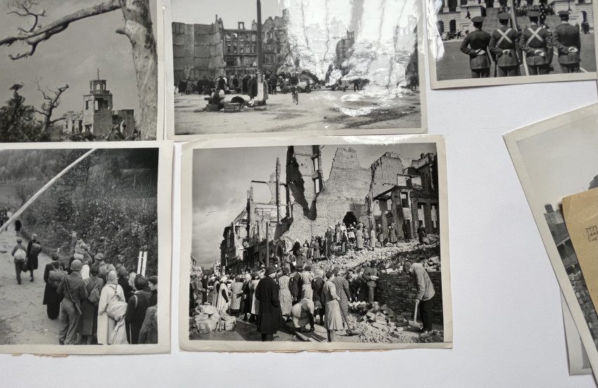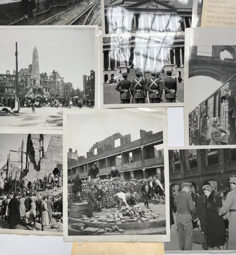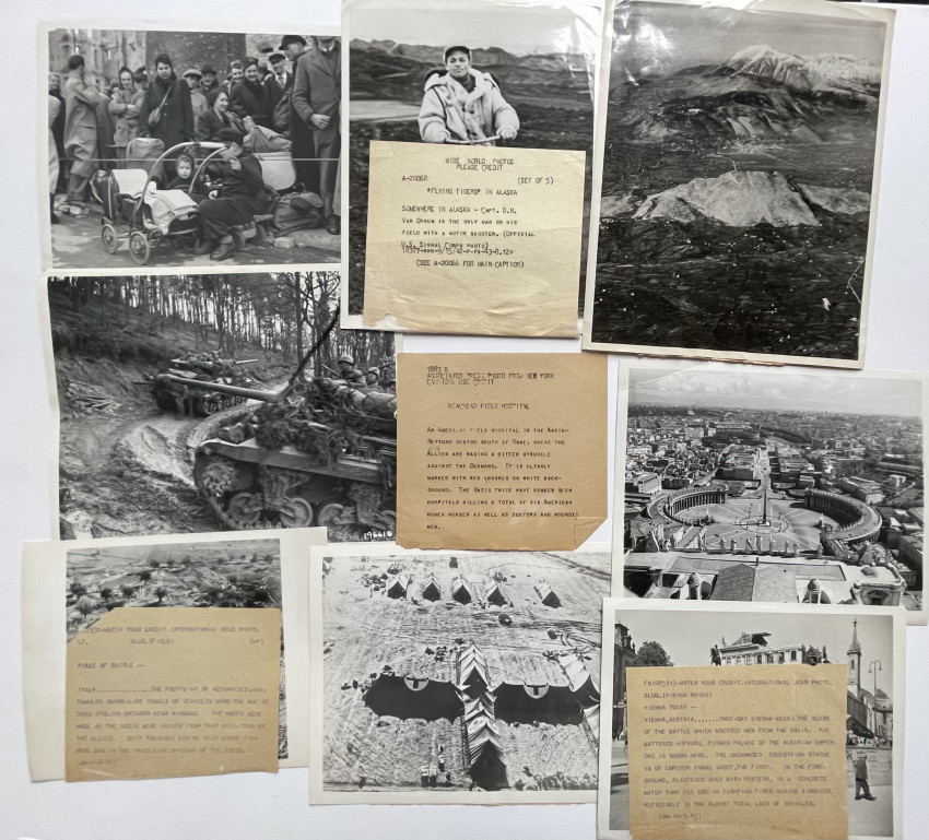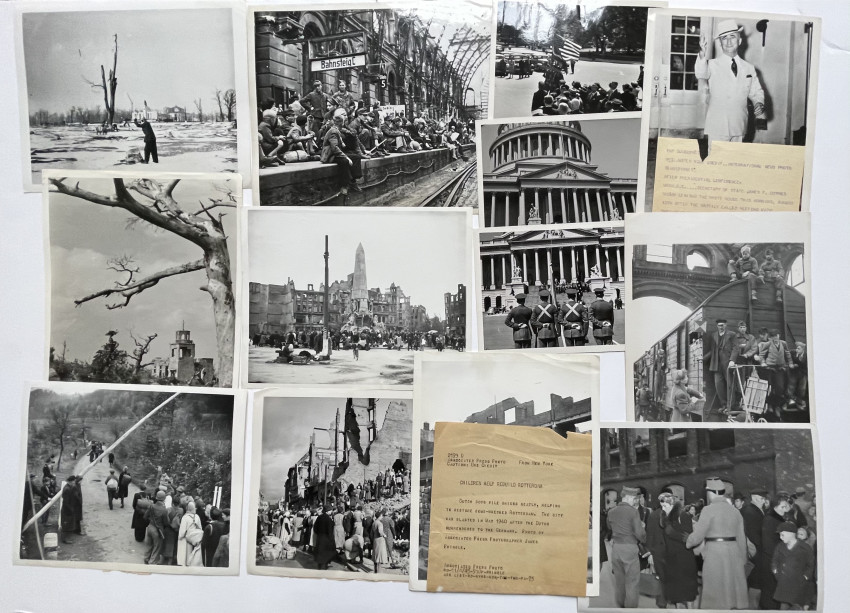 Collection of photographs documenting WWII Europe, from battles to humanitarian activities. Most stamped, retaining printed descriptions.