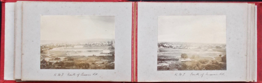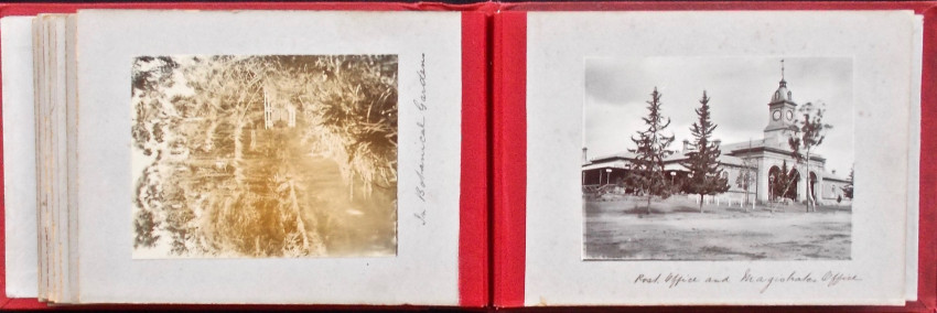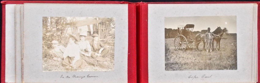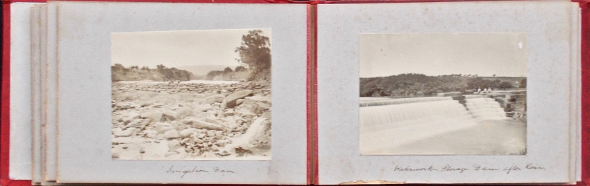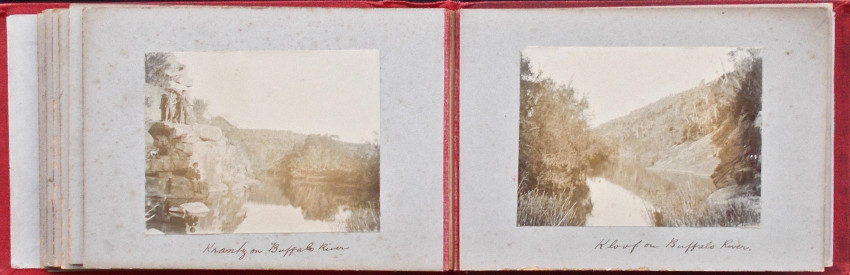 Vey good original red cloth covers with titles in gilt on the front cover. Some marks on the front cover but otherwise this photo album is in very good condition. This album was compiled in the late 1890s by James Herbert Williams, popularly known in the Victoria Province of Mashona-land as 'Jakata', who was the first Native Commissioner (Mudzviti) at Gutu. The album contains twenty (20) mostly sepia 11cm x 8cm original photographs most likely taken by Williams himself. There is a handwritten description below most of the photographs. All photographs are in very good condone with no foxing, marks or other blemishes. The photographs include two of J. H. Williams himself, the Gibbard and Bryant outfitters in East London, the bridge over the Buffalo River, in the Eastern Cape, the Botanical Gardens in East London, gallows in an unidentified prison yard, views of Knysna in the Western Cape, workers in an orange grove (probably in the Western Cape), a Cape cart, an irrigation dam in an unidentified location, the Waterworks Storage Dam near Kaim, the Yellow Wood Falls, a hat covered in tin refuse, three men standing on a krantz (overhanding wall of rock) on the Buffalo River, a kloof (narrow valley or gorge) on the Buffalo River, the Post face and Magistrate Office (unidentified location) and finally another photograph of Williams standing among Arum lilies. All photographs are in very good (+) condition with foxing, marks or other blemishes.