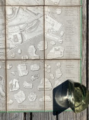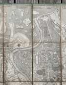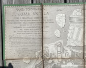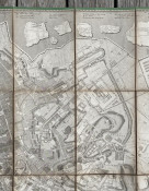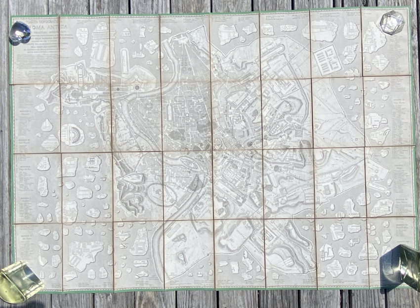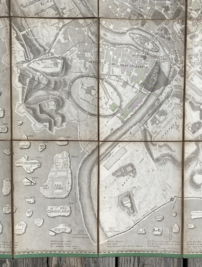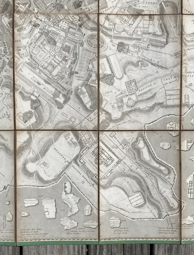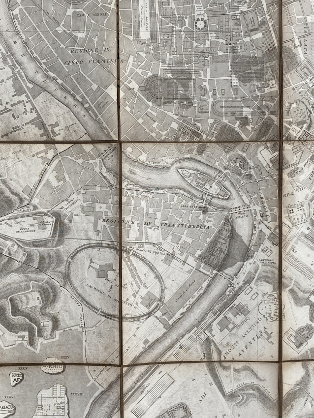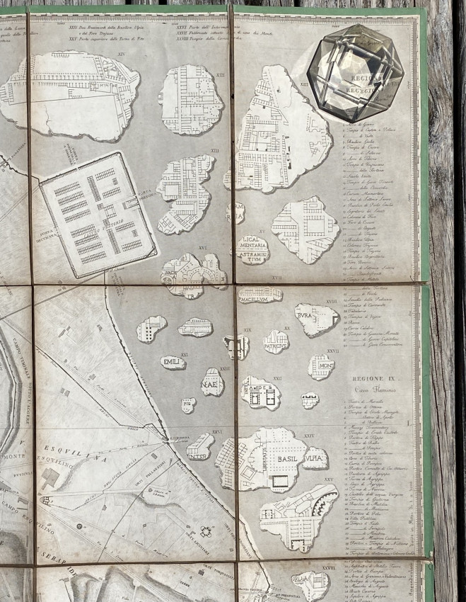 A fascinating plan of Rome: the locations of the classical buildings and monuments are overlaid onto a map of the modern city and the central city is surrounded by classical fragments of carved marble.
