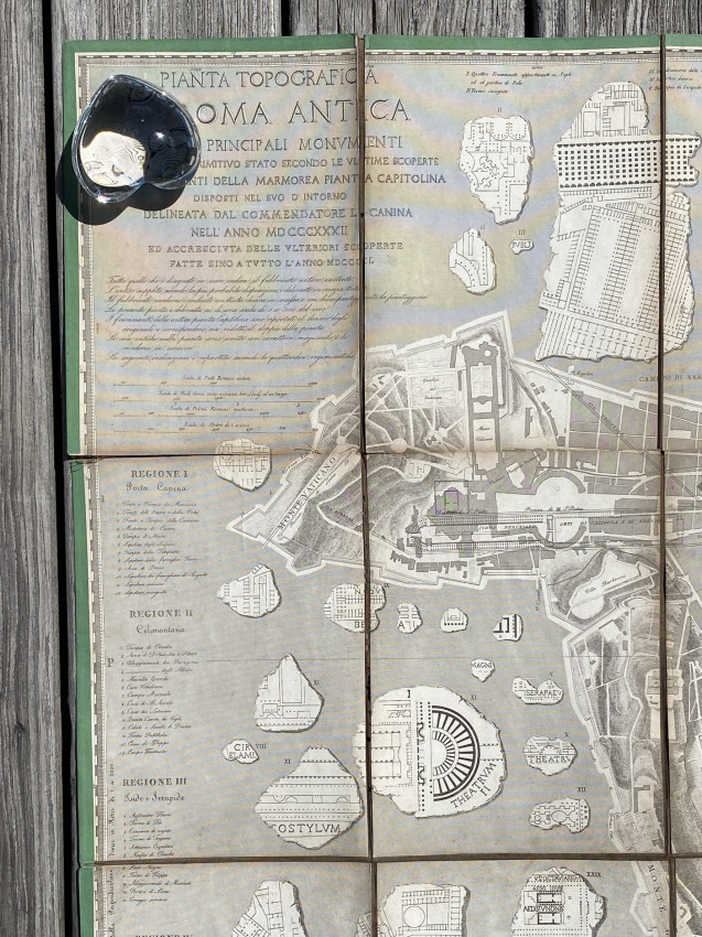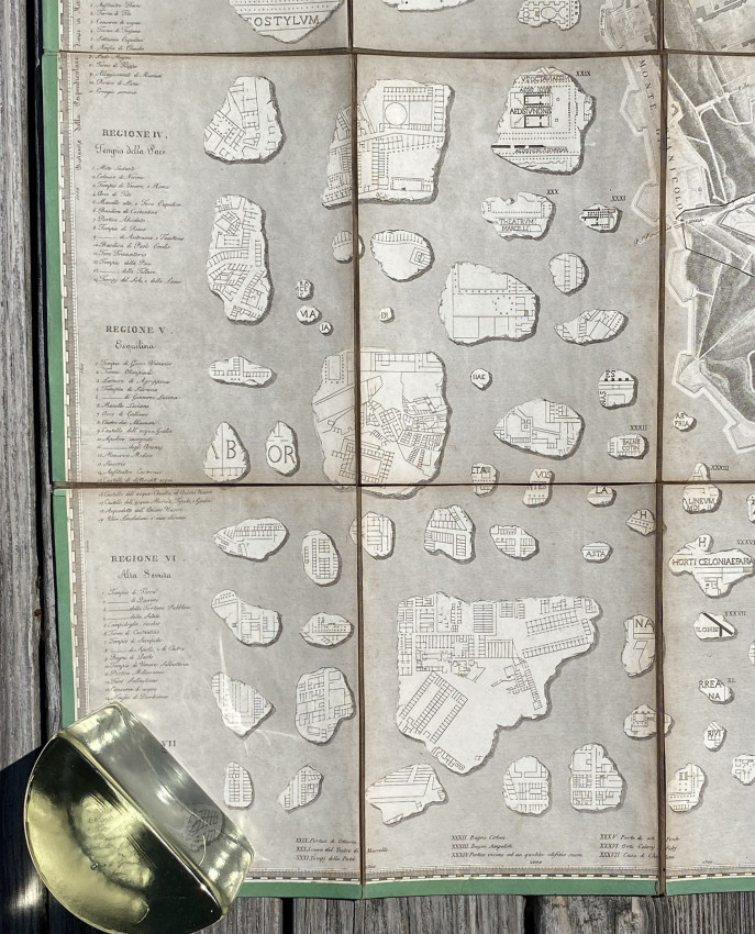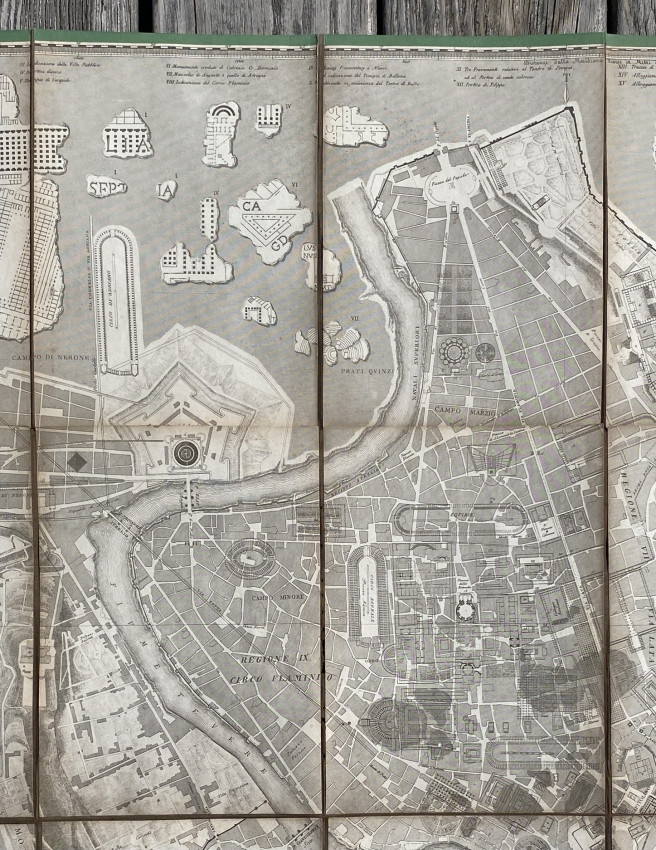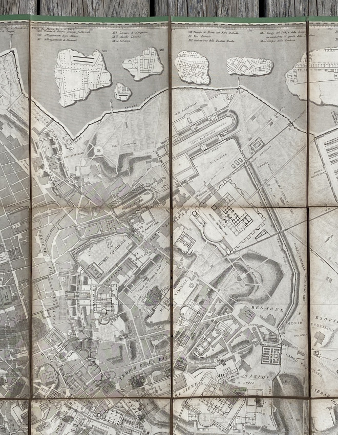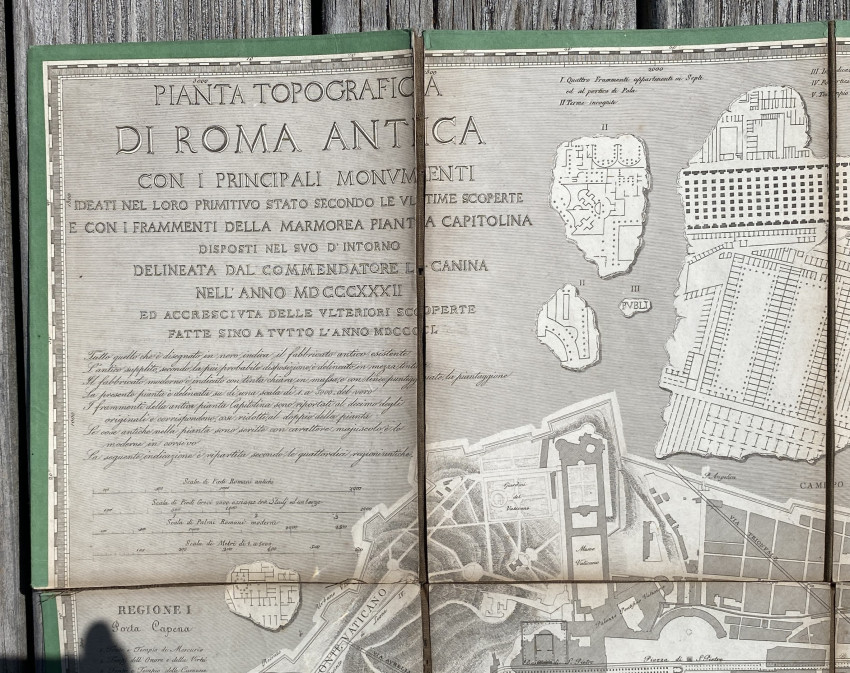 Pianta Topografica Di Roma Antica Con I Principali Monumenti Ideati Nel Loro Primitivo Stato Secondo Le Ultime Scoperte E Con I Frammenti Della Marmorea Pianta Capitolina Disposti Nel Svo D' Intorno Delineata Dall'Architetto Cav L.Canina Nell' Anno … MDCCCL. Rome: 1850. Folding engraved plan (38 3/8 x 55 3/8 ins; 974 x 1400mm), in sections, backed onto cloth (some splits to folds). Provenance: Oscar Browning (1837-1923, large wood-engraved bookplate [from a design by Simeon Solomon] dated 1870, mounted on verso).