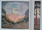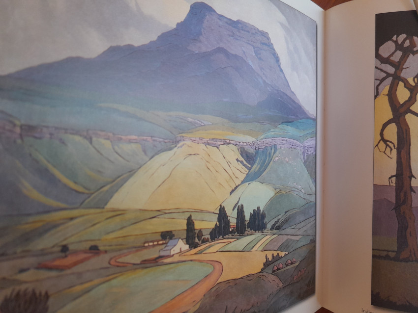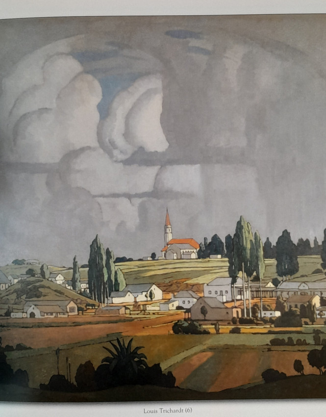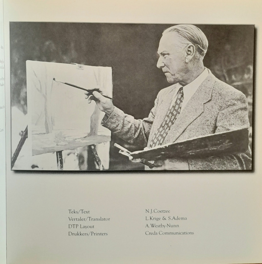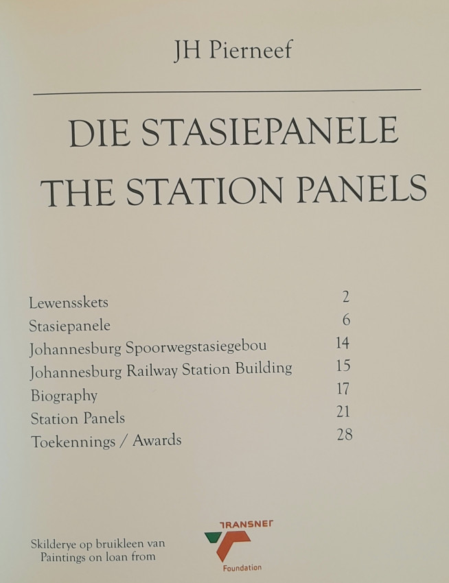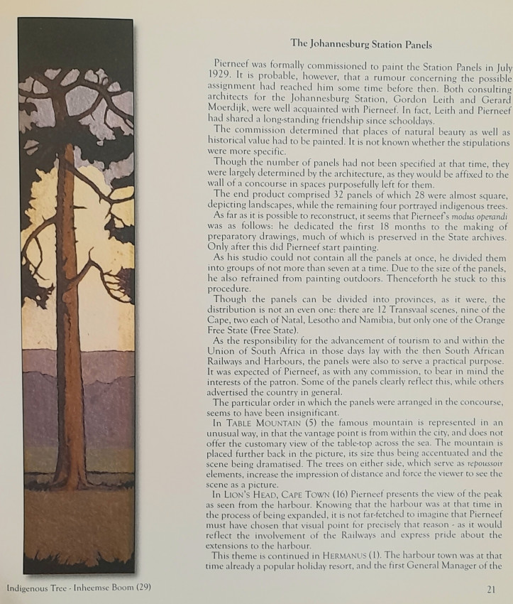 Includes all of the station panels. Text in Afrikaans and English. "Pierneef was formally commissioned to paint the Station Panels in July 1929... The commission determined that places of natural beauty as well as historical value had to be painted. The end product comprised 32 panels of which 28 were almost square...".