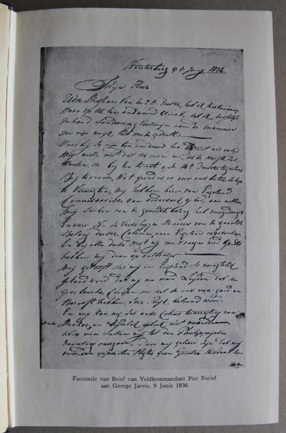 571 bladsye, blou linneband. In besondere mooi toestand. Oopvou kaart met Piet Retief se Kaapse Hugenote Stamboom. Stofjas het 'n paar merkies rondom sye en versterking met kleeflint aan binnekant. Vyf swart en wit illustrasies.