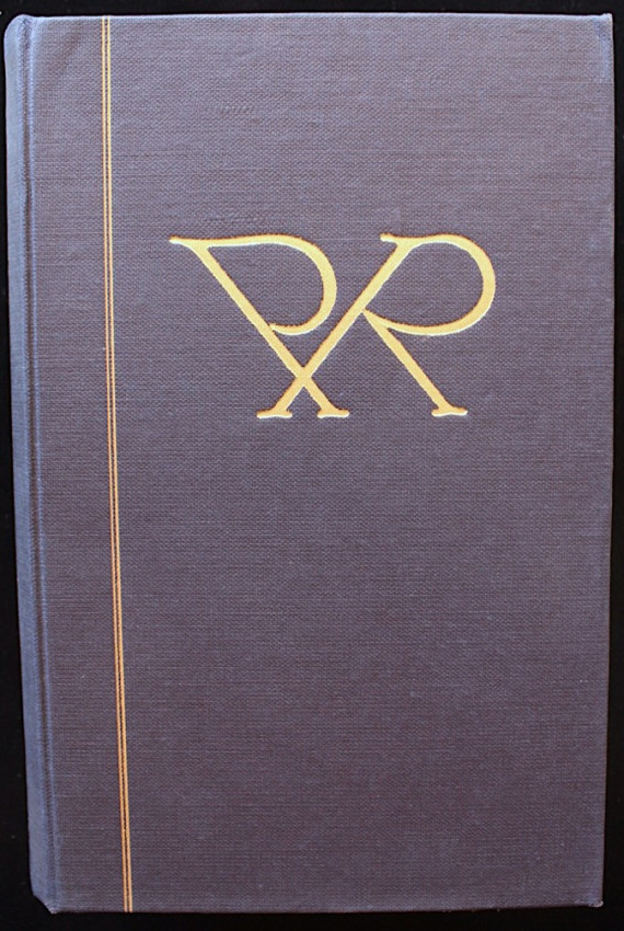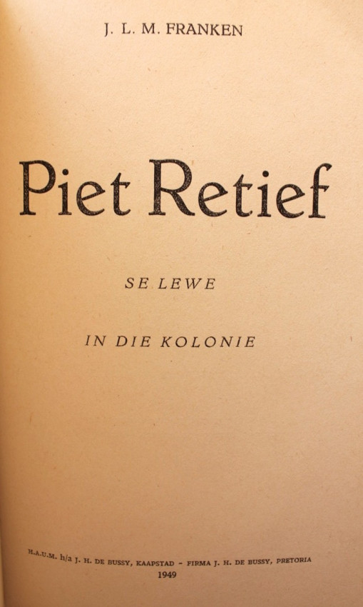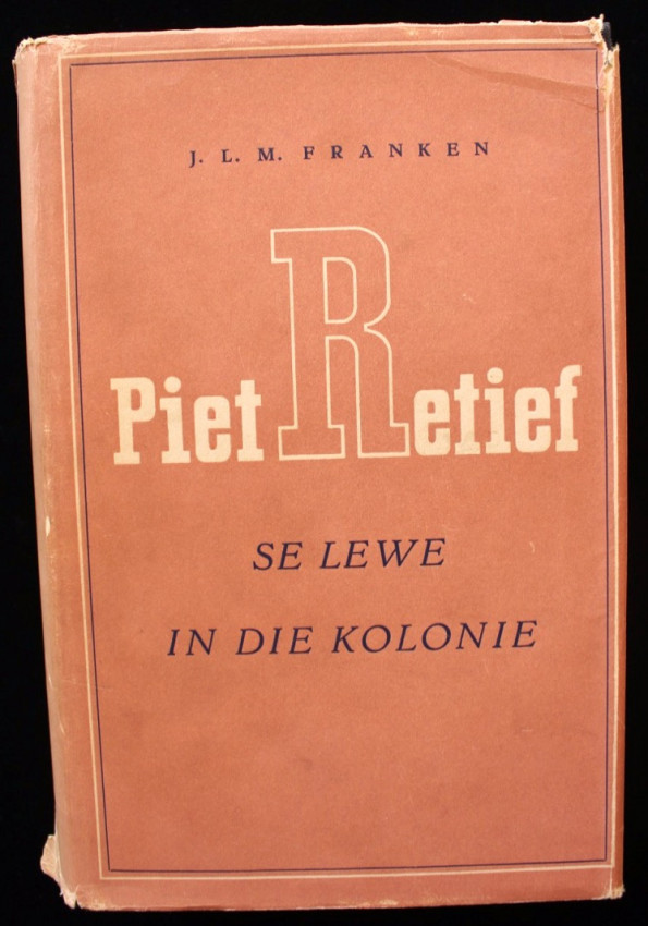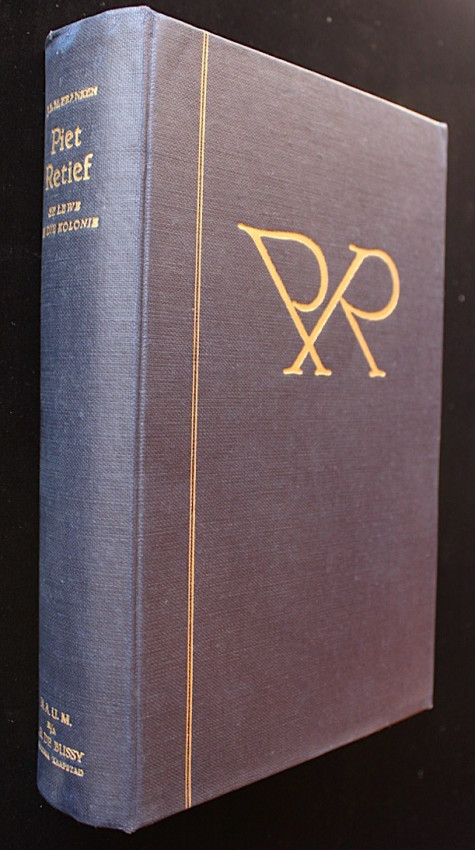 Publisher's navy blue cloth binding with Piet Retief's embossed monogram in gilt on the front panel and gilt titles on the spine.