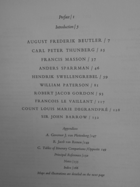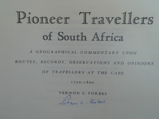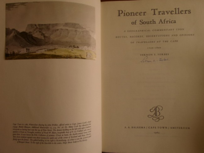 Forbes's outstanding book was based on his 1957 Rhodes doctoral thesis. Although published in this complete form in 1965, most of the chapters had previously seen the light in issues of the South African Geographical Journal and other publications. Even though it covers only half a century, Forbes's work surveys the itineraries and publications of 10 travellers, most of them well known, including Barrow (Forbes's favourite, from a geographical point of view), Le Vaillant (the author records his reputation as a boaster but an excellent draughtsman, the latter borne out by Forbes's own joint editorship of a major book on Le Valliant's art [see also Lot 5]), Thunberg, Sparrman, Paterson, Gordon and others.