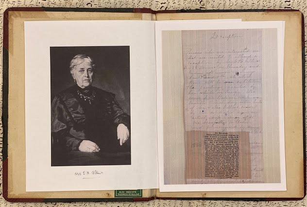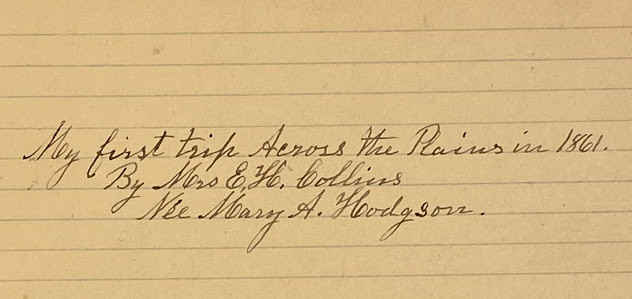 Manuscript “My first trip Across the Plains in 1861. / By Mrs E.H. Collins / nee Mary A. Hodgson”, [undated, but circa 1900-1910?]. Quarto (9 3/8 x 7 ¼ in; 138 x 84mm). 26pp. of text written recto only of the first 26 leaves in an album of 74 leaves. Original cloth binding.
