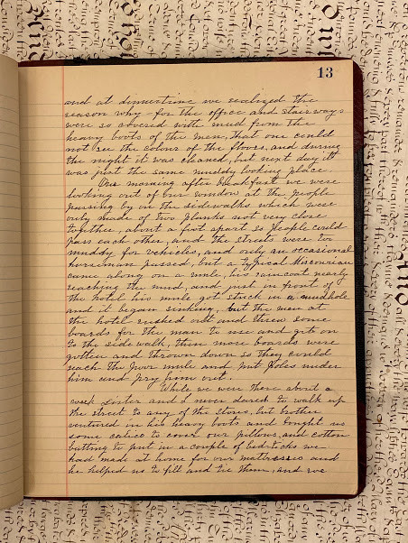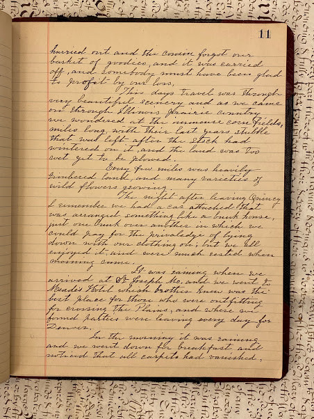 From Plattsburgh the party travelled by train to Toledo, Ohio (where they stopped for breakfast: ‘coffee, hot rolls and fried oysters. Never again have I tasted Oysters so as they..’). They then changed trains: ‘This days travel was through … Illinois prairie country…. The night after leaving Quincy [Illinois] I remember we had a car attached that was arranged something like a bunk house, just one bunk over another in which we could pay for the privilege of lying down with our clothing on ; but we all enjoyed it … They spent a week in St.Joseph, Missouri, getting together a party to cross ‘the Plains’. Mary’s brother buys ‘a fine pair of Horses, and a white canvas covered Studebaker wagon with one spring seat in front for the driver, that could be removed when camping …’ The eventual party included ‘our two cousins and their passenger, also a Missourian with a team of horses, and five passengers who desired to keep up with us’. These passengers were ‘John Yule, Thomas Carter, and Wm. Stone, from Kenosha Wisconsin, Bradford B. Stiles a lawyer from Chicago, Illinois and Judge Bacon who was returning to Pueblo … How little did we then think that [Stiles] … would be twice elected Mayor of Denver, and his portrait painted in the rotunda of our Capitol!’ The first night they thwart an attempt to steal their horses, described in detail by Mary. She is also very fond of describing what the ate during the trek, going into detail about a number of meals.