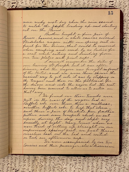 Charmingly, she goes into great detail about the outfits she and her sister-in-law wore as they set off ‘Our bonnets were of black Straw, alike in shape … Coats were of Burnoose or loose fitting, made from fawn coloured Broadcloth. Dresses were of light brown with white checks, made plain short waists, buttoned in front, long sleeves, and plain full skirts, with one large double boxed plait [sic.] in front and one in the back & silk belts with buckles on the front. We had both been down in New York City a short time before, and considered ourselves dressed in the latest style’. ‘We were accompanied by two cousins, George W. Hodgson, Joel Hodgson, and a Frenchman August Roberre who was being taken by brother to work on the Ranche [sic.]’