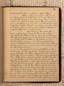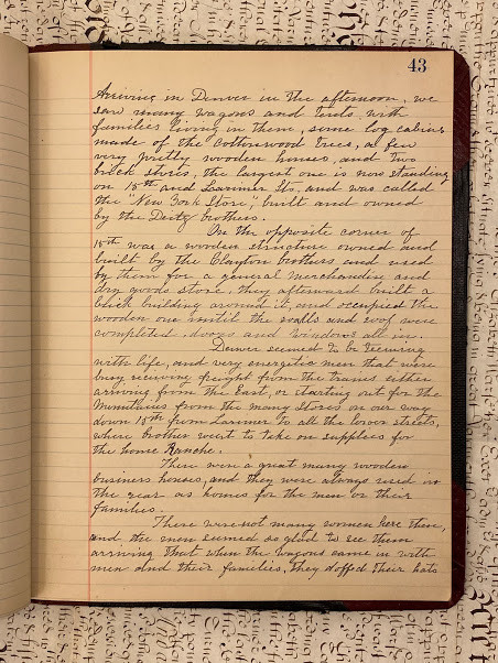 Mary goes on to give a description of Denver as they found it, staying at the Fremont Hotel (owned and kept by Nelson Sargent), describing some of the stores and churches, and finishes by down-playing the ‘hardships’ they encountered on the trek across the plains and also describing the final arrival at her brothers’ ranch: ‘We arrived at the house after dark and surprised our Brother William at the kitchen table just cutting out some cream biscuits…’ The account finishes with a short aside about the clothes her brother was wearing, and a description of a visit by surveyor Hal Sayre wearing ‘an entire suit of fringed buckskin’.