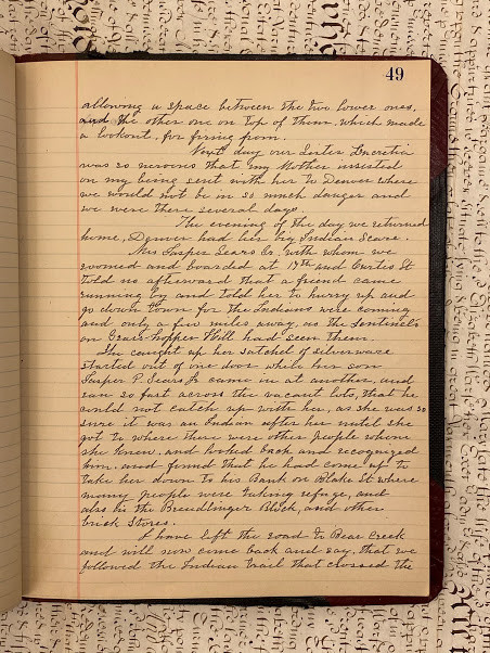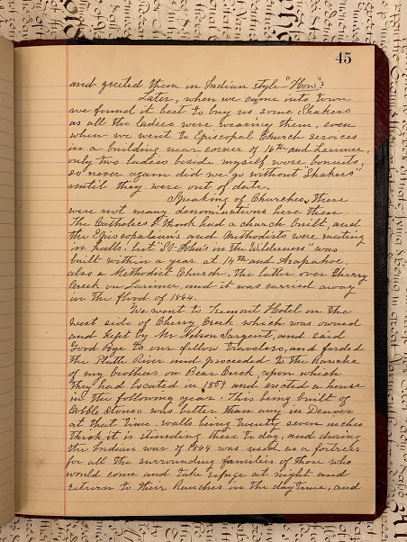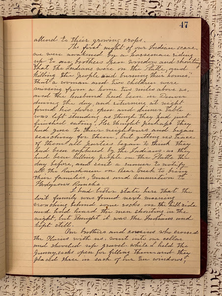 “We were often visited by Indians … they were Cheyennes & Arapahoes”. Mary continues with observations and comments including the fact that the ‘Indians’ were friendly until ‘their war of 1864’ [i.e. the Colorado War]. This is mentioned later with descriptions of how her brothers’ house was used as a ‘fortress’, and of the way some reacted in Denver when news of a supposed massacre reached the city.