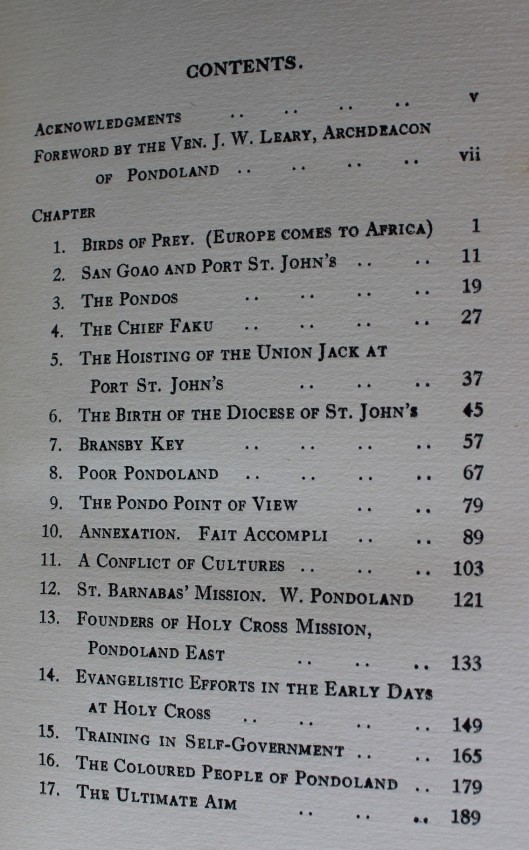 Undated (but possibly 1938) with 199 pages. Frontispiece of Pondo woman and child. Map of Pondoland and 6 more illustrations. Chapters include: San Goao and Port St. John`s, Chief Faku, the hoisting of the Union Jack, birth of the Diocese of St. John`s, Bransby Key, annexation, conflict of cultures, St. Barnabas` Mission, Founders of Holy Cross Mission, Coloured people of Pondoland. Previous ownership in front. This is a history of the pioneers ( mostly Church missionaries) in Pondoland (later known as Transkei). This is a good copy.