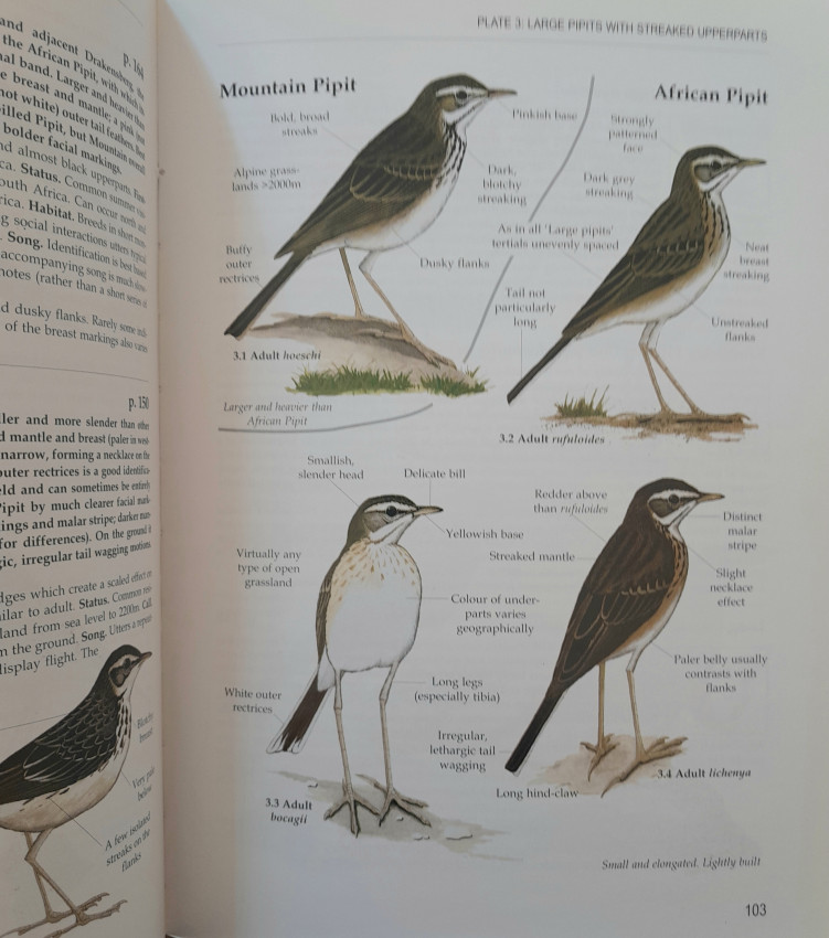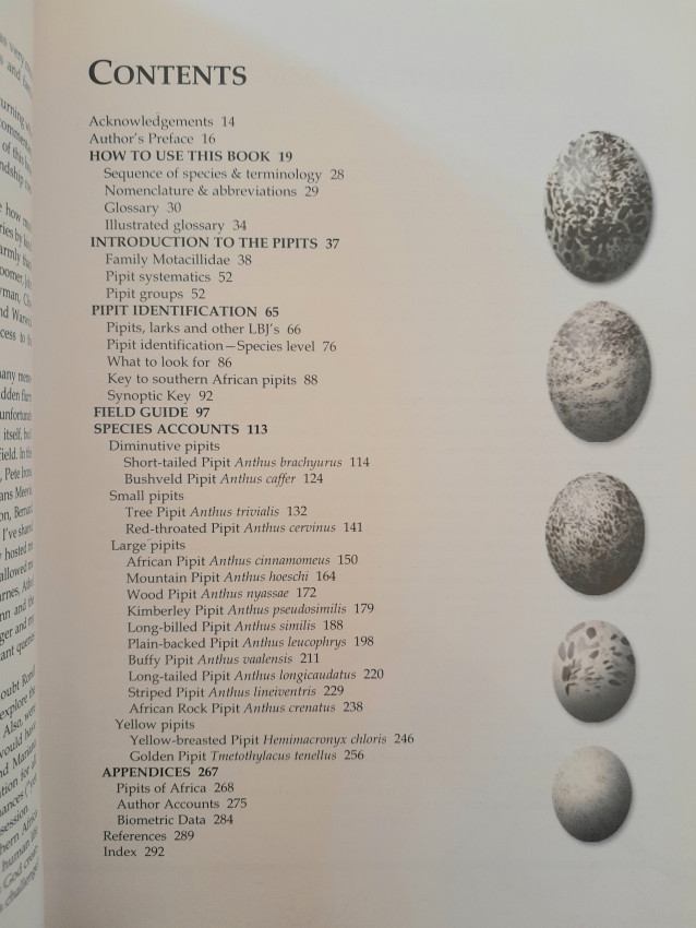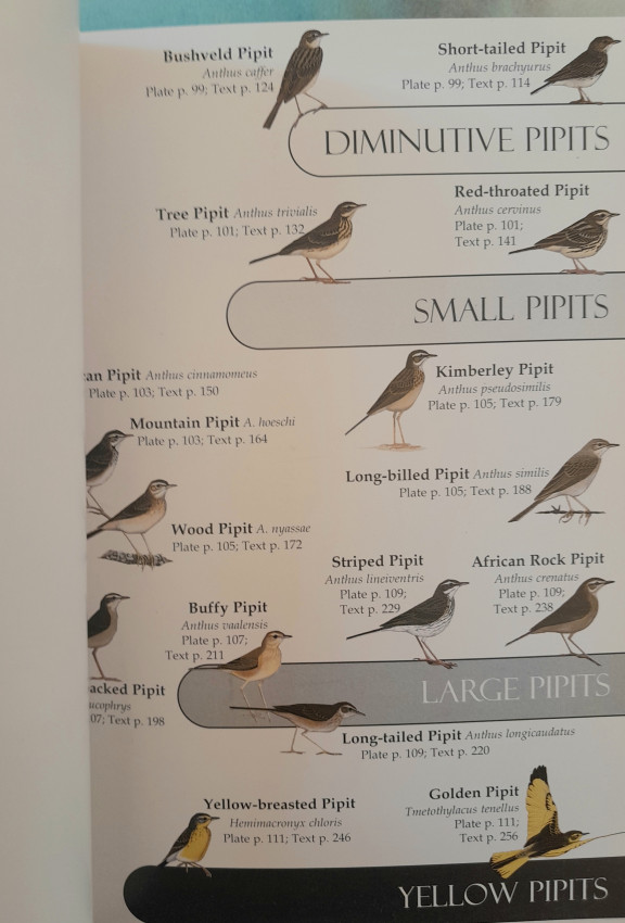 From the cover: "Pipits of southern Africa is the most extensive and up-to-date identification guide ever produced on African pipits. The book is a celebration of the oft-frustrating, yet highly rewarding challenge that this group of LBJ's provides to bewildered beginners, frustrated experienced birders and professional ornithologists alike".