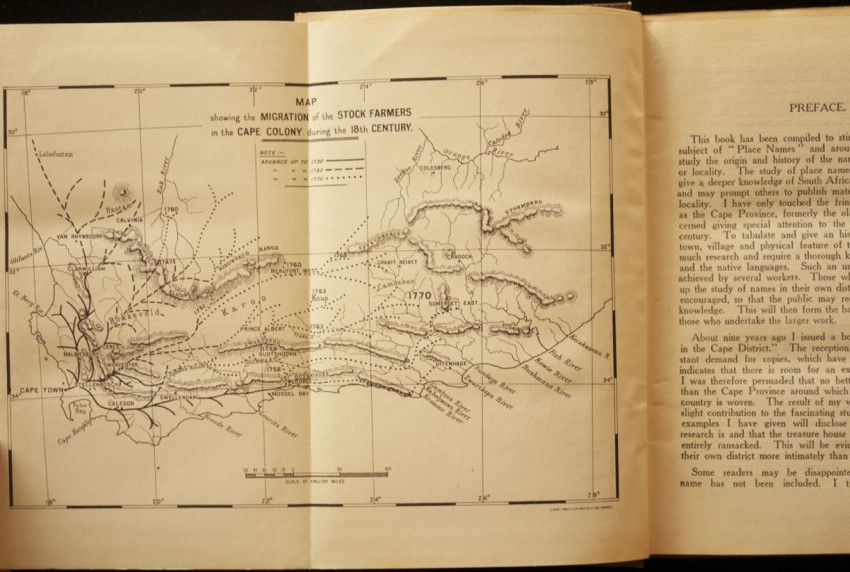Hardcover, 186pp. Fold-out map at front showing the migration of the stock farmers in the Cape Colony during the 18th century. Publisher's pebble grained cloth binding.