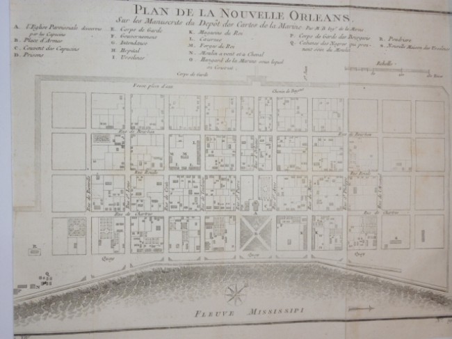 Paris: 1757. A pleasing example of this attractive mid-18th century engraved plan. Key locates churches, town hall, and numerous points of military importance. Sheet measure 11 3/4" W x 10" H. Image measure 11" W x 7 1/2" H.In near excellent condition. Original fold line as issued. Bellin's superbly detailed street plan of mid 18th-century New Orleans (today's French Quarter), with an 18-point key to the city's major sites and monuments, from the atlas of Prevost d'Exiles' influential travel book, Histoire Generale des Voyages.