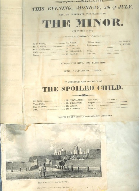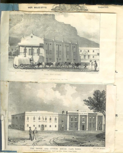 Plus three lithographed De Meillon views, from the same publication (The Theatre, The Tronk and Custom House Cape Town, and The Castle Cape Town), images between 8.5-95. cm h x 15 cm w, one imprint and two upper margins trimmed, laid to stub along left edge, one with small old stain, two views joined by old paper laid to rear. With three contemporary London theatre and concert bills and programs attached to the same stub.